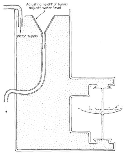 The tube was mounted vertically in a large basin that was filled with the falling water. An overflow pipe drained the additional water into a nearby sink. The flow of water from the faucet was controlled by a stopcock. With this setup Hopwood's water bells joined with the surface of the water in the basin, giving the bells a closed interior. Hopwood created either round-top or saucer-top bells by adjusting the height of the slit above the water level in the basin, the width of the slit and the rate of flow. Some of the bells with saucerlike tops had sides that either bent inward or were straight but slanted. In some instances the edge at the point of turnover was quite sharp. At times the edge formed cusps, and Hopwood saw small drops being thrown over the edge. When he made a large bell and then slowly decreased the flow rate of the water, the bell generated a series of these stable shapes (sides either straight or concave) in addition to unstable ones as it shrank. When it had become quite small, it could assume the shape of a cylinder with straight vertical sides.
