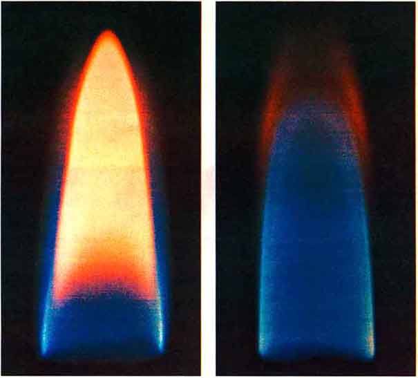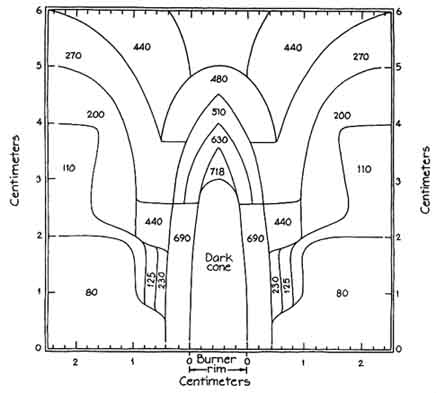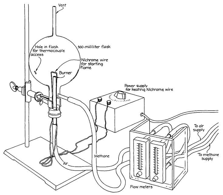 The normal and reverse flames investigated by Travis are diffusion flames: the burning requires the mutual diffusion of the fuel and the oxidizer into the flame front, the surface where the burning takes place. In the other general type of flame, premixed flames, the fuel and the oxidizing agent are mixed before they reach the flame, as in a Bunsen burner. Diffusion flames and premixed flames can be either laminar (that is, smoothly flowing) or turbulent, depending on the rate of flow of the participating gases. Travis limited his attention to laminar diffusion flames. The commonest example of this type of flame is a candle flame, which I discussed in this department for April, 1978. One might think that laminar diffusion flames are well understood, since candle flames have been investigated for a long time, but it is not so. Flames are exceedingly difficult to understand even in general terms, much less in detail, because of the wide variety of phenomena occurring in them. Many chemical reactions take place, and many of them are complex. Light is emitted by both chemical and thermodynamic phenomena. Gases expand as they are heated. Heat is transferred across the surface of the flame in several ways. The flow is in three dimensions. Probing the flame usually distorts it in inexplicable ways. Students of flames concentrate on several key features: color, shape, temperature distribution and burning velocity. Burning velocity is the rate at which the flame propagates perpendicular to the flame front. The propagation can be either through a stationary gas or, as in a flame on a stove, through a flame that remains stationary while the gas flows. It is easy to calculate the burning velocity when the flame front is flat but more difficult when the flame front is curved, as it is with most burners. Another matter of interest in the investigation of a flame is the reaction zone, the region where the fuel and the oxidizer meet. Part of the light from the flame emerges from the chemical reactions in this zone. In a normal diffusion flame the reaction zone is blue, largely because of the blue emissions of the molecules excited by the chemical reactions in the zone. If the rate of flow of fuel is sufficiently low, the entire flame may be blue. An example is the flame of a candle with a thin wick. With a somewhat greater flow of fuel a yellow or white tip develops near the top of a normal diffusion flame. As the flow of fuel is increased further the yellow or white region grows, eventually dominating the flame and relegating the blue reaction zone first to the sides of the flame and then finally to just the side regions near the base. The yellow-white tip consists of carbon particles that have become hot enough to emit radiation more or less continuously across the entire visible spectrum. The combustion chamber employed by Travis for his investigation was made out of a 500-milliliter round-bottom flask. The flask was held upside down on ring stand by a clamp. Projecting upward from the round surface was a tube that had been annealed to the flask. A similar tube projected sideways from the neck. A stopper in the neck carried a short burner. To make a normal diffusion flame Travis supplied methane to the burner tube and air to the side tube. For a reverse flame he interchanged the supplies. A small hole in the side of the flask gave access for a thermocouple to probe the temperature of the flame. Also passing through the stopper in the neck were two electrical leads to the Nichrome wire Travis employed to start the flame inside the flask. His air and methane came from tanks in his school laboratory. To light a reverse flame Travis placed the length of Nichrome wire across the mouth of the burner tube and then turned on the methane. After about 15 seconds the flask was filled with methane and he could light the gas escaping through the vent at the top of the flask. (He needed the 15 seconds to avoid having a mixture of a small amount of methane and a large amount of air, which would explode.) He adjusted the flow of methane until the flame at the vent was four or five inches high. After the reverse flame was created inside the chamber the flame at the vent burned off the excess methane escaping from the chamber. The Nichrome wire was connected by two leads to a current source, which was then turned on enough to make the wire glow red. Next the air tank was turned on to supply air at a low rate (about .6 liter per minute). The flow of air had to be low at first or the amount of oxygen supplied by it might have caused the flask to explode. The hot wire ignited a flame at the mouth of the burner; this was the reverse flame. The current on the wire was then turned off and the leads through the stopper were wiggled until the wire was brought down from its position over the mouth. The flame was more distinguishable in the dark, so that most of these things were done in dim light. To extinguish the flame Travis turned off the air first to avoid any danger of explosion. Travis lighted the normal flame by a similar procedure. Again he carefully avoided lighting the flame at the top of the flask while a small amount of methane was in a large amount of air. He turned on the methane first to fill the flask before he turned on the air. To turn off the flame he first turned off the air. When I asked him about the danger of explosion, he replied that he had had no problem with the reverse flame but that with the normal flame he had occasionally had an explosion that blew the stopper out of the flask. To guard against a more serious accident anyone doing this kind of experiment should wear a face shield. Moreover, a combustion chamber larger than Travis' 500-milliliter flask should not be used or the hazard of explosion will be greater. The distribution of temperature in the flames was measured with the thermocouple probe slipped into the combustion chamber through the small hole. Travis got his thermocouple from the E