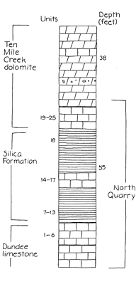 My most rewarding digging was done in the stone quarry near Toledo. The quarry contains part of the rock unit known to fossil collectors as the Silica Formation, which was formed 350 million years ago in the Middle Devonian period. It was part of the sea in what is termed the Michigan Basin. The basin held a saltwater sea that extended into Ontario and for a while into New York. After the sea had receded and disappeared uplifting, warping and erosion of the ground exposed and removed much of the Silica Formation. What remains is rich in fossils. Six zones of sediment deposition have been identified in the Michigan Basin. Only two of them are important in the Toledo quarry. One zone is called the coral-brachiopod zone; it consists of limestone. and calcareous shale holding fossils of corals and large brachiopods and a few bryozoans, crinoids and blastoids. The other zone is called the diverse-fauna zone. It was originally mud flats and now consists of clay stone or shale with little calcareous content. It holds fossils of bryozoans, brachiopods, ostracods, trilobites, corals and other marine animals. Some people believe the ancient sea at the site of the quarry must have been no deeper than about 150 feet. If it had been deeper, the corals would not have received enough sunlight for growth. If it had been considerably shallower, evidence of turbulence from the surface waves would appear among the fossils. Very shallow water would probably have been too rough for crinoids and other rather frail animals. Much information about the fossils of the quarry has been collected in a book, Strata and Megafossils of the Middle Devonian Silica Formation, by Robert V. Kesling and Ruth B. Chilman, published at $10.50 by the University of Michigan Museum of Paleontology, Ann Arbor, Mich. 48104. The quarry is divided into a northern and a southern section by a county road. The southern section is closed to collectors because it is still being mined. The northern section has not been mined in years and is open to amateur collectors, although I have heard a rumor that new owners will soon close it. The northern section is partly filled with water that has run off from the surrounding land. At the sides of the quarry are steep cliffs where the fossil-containing strata of limestone and shale are exposed. Fossils can also be found in the piles of shale and limestone mined and then dumped on the surrounding land. Corals and