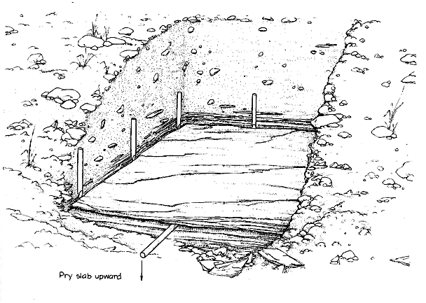 The general strategy for digging on a slope is to level a section so that slabs of rock can be lifted and examined. When I worked on a slope, I began digging well above the stratum in which I was interested. My initial cut was high enough so that a straight line downward would cross through the stratum at least a meter in from the slope. Digging out the overburden took hours and considerable effort with a pick and shovel. Sometimes the overburden itself yielded interesting fossils, but usually this stage of the digging was simply tiring. When I finally had the overburden cleared away, the shale at the level I was interested in was exposed for several square meters. Along the sides and the back of the exposed area I pounded long chisels to a depth of four or five centimeters with a sledgehammer, rocked them slightly and then removed them. Next I carefully drove a long chisel horizontally into the side of the shale layer several centimeters below the top surface in order to pry up a slab. The chisel holes at the rear and the sides facilitated the proper fracturing of the slab. After lifting the slab I examined the bottom of it and the top of the layer of shale under it. If I saw no fossils, I stood the slab on one edge and split it further by tapping a small chisel or screwdriver into the other edge with my hammer. Although the shale is easily split, the splitting should be done with restraint. I have destroyed some beautiful trilobites by heavy-handed hammering. Digging out the overhang and the slabs this way is hard work and can take hours or even days. Some people prefer to dig directly into the wall. The advantage of the longer and more careful work becomes apparent if you open up a slab that holds several good fossils. Single fossils can be recovered by digging straight into the wall, but the chances are slim that you can avoid damaging the delicate types such as the flat trilobites or the complex crinoids. On the other hand, if you can lift out a slab with several good fossils in it, you have a valuable discovery because the slab will be far more impressive than a single fossil cleaned and removed from its matrix. Scott Vergiels of Temperance, Mich., recently showed me a slab he had wrestled out of the quarry near Toledo. It