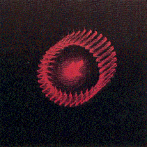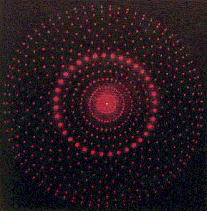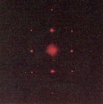 mechanical oscillation to redirect the laser beam. The interference techniques were worked out by David Yoel, a student at Cleveland State, to whom I am indebted for his labors. The best displays were created with diffraction gratings sold by the Lumens Corporation, a California-based company that supplies optical materials for laser-light shows. The gratings I have give a dispersion of medium quality, but the company also sells gratings that give high quality dispersion. All the gratings are made of transparent plastic on which a pattern has been laid. The procedure for making the gratings is undisclosed. One grating generates a diffraction pattern of the kind seen in an introductory physics class; when the grating is held in a laser beam, a row of bright dots is cast on a screen. A second grating creates a cluster of bright dots surrounded by dimmer ones. A third grating creates a similar cluster except that the bright dots are arranged rectangularly. A fourth kind of filter has been constructed from pie-shaped segments of the first type of grating. All the apexes of the segments are grouped at the center of the filter. When the filter is placed in an expanded beam from the laser, a row of dots is produced by each segment. Since there are 48 segments, 48 rows of bright dots extend radially outward from the center of the pattern. The display is impressive, but it is outshined by the pattern cast by the fifth filter, which Lumens calls a Chromasphere grating. That filter creates the illusion of a Christmas-tree ball brilliantly decorated in red. The center of the pattern has an extremely bright dot of light. Around it is a circle of bright dots. On both sides of the circle are dots of red in an array that gives the illusion of the surface of a ball. (For a limited time I can supply readers with a small sample of this Christmas-ball diffraction grating that is suitable for use with a student-oriented laser. Send $1 and a mailing label to me: Physics Department, Cleveland State University, Cleveland, Ohio 44115.)
