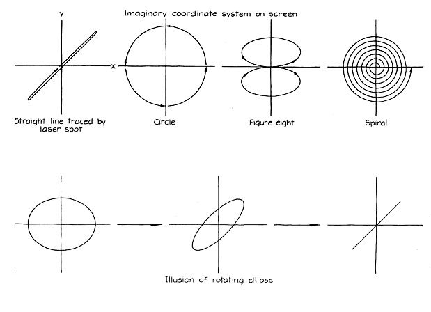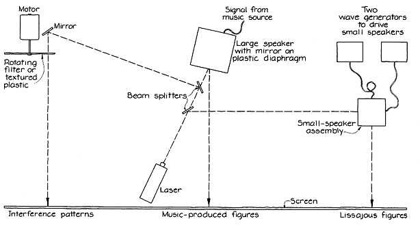 In each show 10 slide projectors cast five simultaneous slide images on wall-to-wall screens. All the images are synchronized to music. During certain parts of a show the projectors hold blanks and therefore do not project an image. Instead two 15-milliwatt helium-neon lasers are turned on and directed through an optical array to create displays of interference patterns and Lissajous figures on the screens. Immediately before introducing the lasers I set off four explosions in front of the screens. When the laser beams pass through the smoke, the paths of light above the audience sparkle brilliantly, giving the impression that the narrow lines of bright red are less than real. The laser techniques I shall describe are of two kinds, one kind based on the interference of light waves and the other on