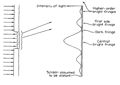 All the gratings work by means of the wave interference of light and particularly by the diffraction of light. The simplest example of diffraction involves light passing through a small slit in an otherwise opaque filter. The slit is very long and narrow, being, say, a few micrometers wide. Indeed, the width is close to the wavelength of the light being passed through the slit. With such a narrow aperture the light is diffracted, that is, it is spread outward along a line parallel to the width of the slit. Hence the light passing through the slit does not entirely continue traveling in its initial direction; instead it spreads to the sides. Something else happens to the light. It is not spread uniformly to the sides but is relatively intense at certain angles and less intense or even absent at other ones. If the light falls on a screen, a pattern of bright and dark lines (usually called fringes) can be seen. This diffraction pattern (both the spreading of the light and the resulting bright and dark lines) arises from the interference of the light waves passing through the aperture. In the mathematical construction of the interference one imagines that the wave front in the slit at any instant consists of a series of small wave generators, each generator sending out a semicircular wave. With a large number of generators side by side the semicircular waves would interfere with one another as they expanded, thereby creating another straight wave front displaced to the side from the initial one. The new wave front would also have an infinite number of such wave generators, each of which would send out a semicircular wave. Again the semicircular waves would interfere with one another and create still another straight wave front displaced from the preceding one. With this model one can describe mathematically how a wave front moves.