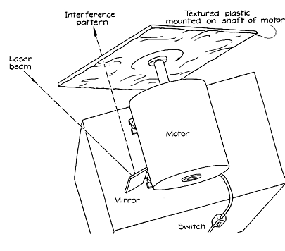 The Lumens workers are experimenting with filters that produce concentric squares or circles. They have also begun marking their products with a new method of indicating copyright. Within each filter is a hologram that identifies the company and the copyright. Even if the filter is cut into small sections, the copyright information is still contained in each section because the holographic image can be reconstructed from each section. The hologram in the filter does not interfere with the filter's main purpose of acting as a diffraction grating. More beautiful decorations can be created by placing two filters in a laser beam. For example, I directed my laser beam through both the Christmas-ball filter and a normal Ronchi filter. (The order of the filters does not matter.) The result is a Christmas-ball interference pattern for each of the three brightest spots cast by the normal Ronchi filter. When I substitute the orthogonal crossed Ronchi filters for the single Ronchi filter, the display is even more complex but is less appealing because of the confusion of dots. The optical illusion of a curved three-dimensional surface is lost in the confusion. Another interesting pattern appears when the beam is expanded with a lens and then f. directed through both the pie-shaped grating and the Christmas-ball one. By rotating the first grating one generates an illusion that swarms of red fireflies are moving on the screen. During a laser-light show you could move the filters around in the beam of light in order to change the display on the screen. The motion can be accomplished automatically by mounting the filters on a shaft turned by a low-speed motor. The beauty is enhanced further if the speed of the motor (and the direction in which it turns) is controlled by adjusting the voltage with a Variac. With such a control you can vary the rate at which the display changes to coincide with the tempo of the music. You can make simple and complex Ronchi filters and many other types of filter by photographing large geometric designs. For example, you could draw a series of black stripes on a large sheet of white paper. Put the sheet on the floor and illuminate it with two floodlights whose beams intersect the sheet from opposite sides at an angle of 45 degrees. Photograph the sheet with a 3 5-millimeter camera aimed downward and triggered with a cable release. If you use slide film, the resulting slide can act as the filter. Many types of optical-transform filter are described in Laser Art & Optical Transforms, by T. Kallard. He points out that drawing the geometric pattern with ink results in stripes that have "soft borders" because of the slight running of the ink. A gradual change in the transmission of light near the borders causes a loss of the greater orders in the interference pattern. If you want the higher order spots in the display, the borders should have abrupt transitions in transmission. Kallard recommends that you use black tape of the kind sold in art supply stores. Lay the tape to form whatever pattern you want. A different kind of interference pattern can be obtained by inserting patterned glass or plastic in the laser beam. I have tried various types of the plastic that is used to cover the recess in which fluorescent lamps are mounted in an office ceiling. All these plastic covers have patterns, but not all the patterns are pleasing in the laser beam. The cover that works best has a surface that looks as though it was sculptured with a putty knife. Other surfaces have hexagonal or semispherical bumps. The surfaces are less interesting when they are merely inserted in the beam, but they yield highly interesting designs when they are slid to and fro across the beam so that the interference pattern constantly changes. Combining the pieces of plastic with one of the diffraction filters can give rise to stunning interference patterns. If either object is mounted on a rotating shaft, the varying pattern can be kaleidoscopic.