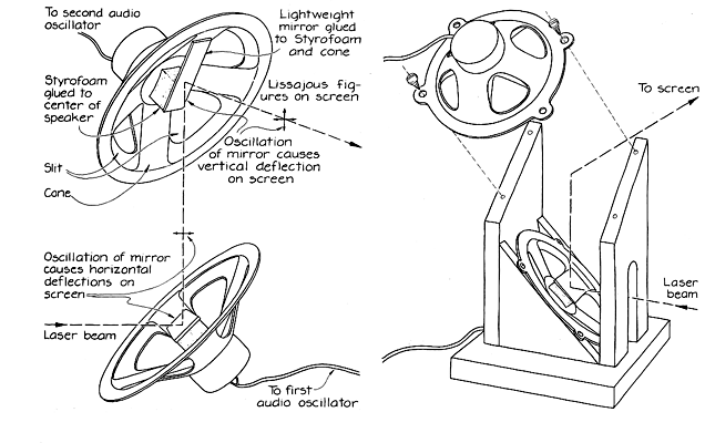 A ruffled piece of plastic generates an interference pattern because the light rays are refracted as they pass through the plastic. The different rays in the laser beam pass through different surfaces, each of which is tilted in a slightly different way. The rays therefore travel different lengths inside the plastic and emerge through surfaces of different tilt. The result is that although the rays were initially parallel to one another (or nearly so, depending on the divergence of the laser), they are no longer parallel after they pass through the plastic. The overlapping rays interfere with one another at the screen to create bright and dark lines. The same effects can be achieved by applying airplane glue or Duco cement to a plate of clear plastic or glass. I distort the glue as it dries, ensuring not only that the surface is rough but also that the glue dries with several small bubbles. The rough surface gives rise to a complicated interference pattern on the screen. The bubbles generate simpler but more pleasing interference patterns consisting of closely spaced dark and bright fringes in a geometric pattern. During a laser show I move a bubble in and out of the beam in order to give motion to the interference pattern on the screen. To achieve any of these interference effects I first have to adjust the distance between the optical components and the screen until images of a suitable size appear on the screen. A completely different set of laser images can be created by using loudspeakers into which an audio signal is fed and from which the laser beam is reflected. Ray Laning, a former student of mine, built such a system with two small speakers (the type commonly found in an automobile radio) driven by two audio oscillators. The idea is to have one speaker deflect the laser beam horizontally as the other one deflects it vertically. The combined deflection can create on the screen the complicated patterns called Lissajous figures. The reflection of the laser beam was achieved by means of a small mirror that Laning mounted on the inside of each speaker. The center of the cone of a speaker is a slightly curved region that oscillates when an audio signal is fed to the speaker. There Laning glued a small piece of Styrofoam that he had shaped to match the slight curvature in the region. The outer surface of the Styrofoam was flat so that he could glue one end of a small, lightweight mirror to it. The other end of the mirror was glued to a portion of the cone about midway between the central region and the rim. Laning used a glue that was somewhat elastic and therefore would not crack or break during the oscillation. The mount and the mirror had to be light in weight because the additional weight Laning was adding would damp or eliminate the normal oscillations of the cone. When an audio signal was fed into the speaker, the oscillations of the cone forced the mirror to pivot (more or less) around the point where it was glued to the Styrofoam. To increase the amplitude of the oscillations Laning cut symmetrical slits into the cone so that they radiated from the central region out to the edge. The slits allowed more play in the oscillations of the speaker so that when the system was in use in the laser show, it gave larger deflections of the laser beam on the screen.