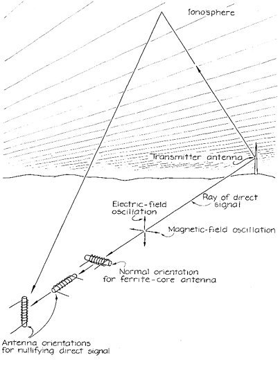 The ionosphere is transparent to radio signals with frequencies higher than about three megahertz. The signals of the television and frequency-modulation (FM) radio bands have a higher frequency, and so they travel direct through the ionosphere. The signals of the amplitude-modulation (AM) radio bands have a lower frequency, and so they are reflected by the bottom of the ionosphere. For this reason gravity waves are normally detected by variations in the reflection of such lower-frequency radio signals. Generating your own radio waves would be expensive and would also call for permission from the Federal Communications Commission. Kohl therefore relies on the signal broadcast by a local AM radio station. He suggests choosing a station that is within 30 miles of you and operates at full power 24 hours a day. Part of the signal broadcast by the station travels direct to the detector and another part travels to the ionosphere and then to the detector. The first objective of the apparatus designed by Kohl is to eliminate the direct signal so that only the signal from the ionosphere is detected. The detector consists of a modified transistor radio with a ferrite-core antenna. The antenna is oriented until the reflected signal from the radio station is at its maximum. This optimum orientation is usually both horizontal to and perpendicular to a line between the receiver and the transmitting antenna. The orientation is necessary because the radio signal is polarized: its electric and magnetic fields oscillate along particular axes. When the electrons in the transmitting antenna oscillate, they radiate electromagnetic waves at the AM radio frequency. The wave traveling direct to the receiver has electric fields oscillating along a vertical axis and magnetic fields oscillating along a horizontal axis. Both sets of oscillations are perpendicular to the line along which the wave is traveling. This line is called a ray. The ferrite core antenna of the radio responds to oscillations of the magnetic field, so that when it is receiving the incoming magnetic fields of the radio wave most efficiently, it is parallel to them. Hence it is horizontal and perpendicular to the ray. (The standard automobile antenna responds to oscillations not of magnetic fields but of electric fields, so that it receives AM signals most efficiently when it is vertical, which of course it usually is.) Kohl eliminates the direct signal from the transmitter by moving the antenna of his radio until the signal from the station is at its minimum. The antenna could be horizontal and pointed in the direction of the transmitter, or it could be vertical. It receives little of the direct signal in either orientation, but it can still receive the radio signal reflected from the ionosphere because it is partially aligned with the magnetic fields in that signal.