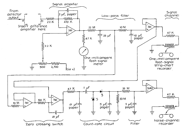 Most portable AM transistor radios have the circuitry outlined in Figure 2 [above]. The circuit is first modified by cutting the connection at the place indicated on the diagram by an x and a y so that the automatic gain control can be converted to manual control. The cut is made next to the volume control of the radio. An additional circuit is inserted at that point to provide manual control for recording the signal reflected from the ionosphere. The weak-sensitivity section of the inserted circuit is necessary to restore the radio's sensitivity to weak stations. If the radio has n-p-n transistors instead of the p-n-p ones assumed in the diagram, the battery connection will be to the positive terminal rather than to the negative one. The polarity of the meter, the recorder and the "zero adjustment" I shall describe will have to be reversed for this type of radio. The output signal from the manual gain control is amplified and filtered by the circuit shown in the accompanying illustration [above left]. The low-pass filter eliminates the modulation of the voice and the music of the radio signal, since you are interested only in the strength of the signal reflected from the ionosphere. The filter also eliminates any short-term clicks, pops and manmade interference caused by light switches, automobile ignitions and the like. The filter does pass the variations in the strength of the reflected signal that materialize over several minutes. These variations, which emerge at the point labeled "Signal channel," are indicated on a strip-chart recorder connected to the other end of the low-pass filter. Kohl, found that a recording speed of one inch per hour is sufficient, and so it is possible to use an inkless strip-chart recorder. The recorder should be rated at one milliampere of direct current. Since the recorder is meant to have a slow response to the radio signal, a meter ("Fast-signal meter") is installed ahead of the lowpass filter to indicate faster variations in the signal strength. This faster response enables the experimenter to adjust the gain controls as he is setting up the apparatus. The meter should also be rated at one milliampere of direct current.