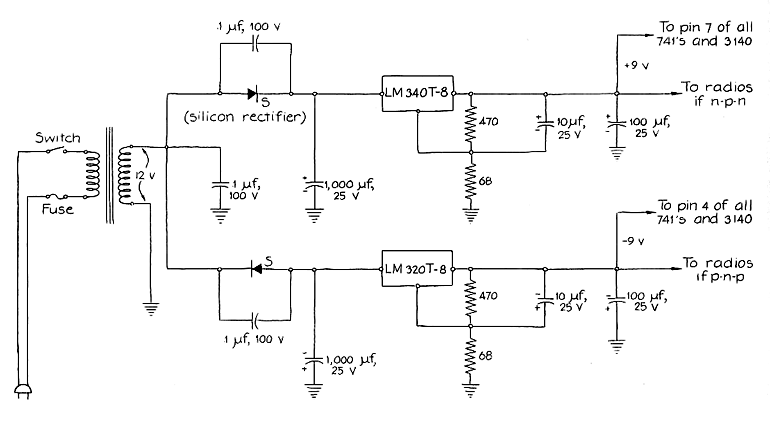 Besides keeping track of the periodic variations indicated on the strip-chart recorder Kohl also monitors the "noise" of the ionosphere with another circuit connected beyond the low-pass filter. This circuit measures the frequency (in times per minute) with which the signal reverses polarity. Each time the strength of the signal crosses a predetermined base line an impulse is sent to the countrate circuit. For example, if the ionosphere is relatively noisy, the signal strength may oscillate fairly rapidly around an average value several times per minute. This rapid variation will be counted. At quieter times the oscillation of the signal strength will be lower. The output of the count-rate circuit is sent through a filter and then through the "noise channel" to another strip-chart recorder of the same type as the one recording the strength of the signal. Kohl employs the power-supply circuit shown in the illustration above to power all the circuits including the radio. Unless the radio has an unusually high current requirement the heat-sink tabs on the voltage regulators (LM 340T-8 and LM 320T-8) will not need to be mounted on heat sinks. Kohl warns against eliminating the .1-microfarad capacitors in this circuit. If they are left out, the rectifiers will interfere with the radio. Once you are ready to monitor the ionosphere you begin by tuning the radio to a distant, weak station. (All the circuit modifications leave the audio part of the radio unaltered.) With the antenna horizontal adjust the weak-sensitivity control to maximize the sound from the station. That control is now set for the rest of the experiment.