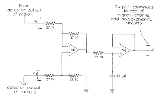 lamps and strokes of lightning. To eliminate the interference Kohl sets up another detector system near the first one. The antennas of the two receivers are approximately parallel but the second antenna is tuned to a frequency that is different by about 100 kilohertz (but a frequency not used by a local radio station). The electrical signal in one antenna therefore does not stimulate a response in the other. The first receiver still responds to the signal reflected from the ionosphere and to interference from other sources. The second set responds only to the interference. The outputs from the two sets are run through a difference amplifier, for which the circuitry is given in Figure 7. The amplifier provides only the difference in the two signals from the receivers. As a result the final output lacks the interference signal and contains only the signal reflected from the ionosphere. With two additional sets one can measure the altitude at which the signal was reflected in the ionosphere. The sets are identical with the first two except that their antennas are vertical. In a horizontal antenna the reflected signal induces a response proportional to the sine of the angle between the horizontal and the ray coming from the ionosphere. The response in the vertical antenna is proportional to the cosine of the angle. The tangent of the angle can be calculated by finding the ratio of the response in the horizontal antenna to the response in the vertical antenna. (The receivers should be identical or the ratio will be off.)