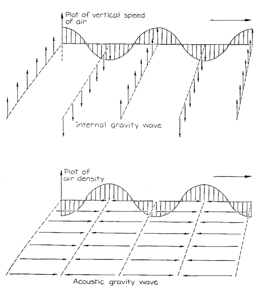 As I have mentioned, in one of Kohl's setups he nullifies the direct signal from the transmitting antenna by means of a vertical receiving antenna that does not respond to the horizontally oscillating magnetic fields in the linearly polarized signal. If the signal reflected from the ionosphere were likewise linearly polarized with its magnetic fields oscillating horizontally, it too would not generate a response in the antenna. Fortunately the polarization of the signal is altered by the reflection in such a way that it can generate a response. When electrons in the ionosphere are set in motion by the oscillating electric fields of the radio wave, they are also affected by a magnetic force resulting from the presence of the earth's magnetic field. The magnetic force comes into play only when the electrons have velocity, so that the force does not operate until the radio wave arrives. The magnetic force makes the charges circle the ray of the radio signal. The interaction of the electric fields of the radio wave, the earth's magnetic field and the motion of the electrons is usually handled mathematically by imagining that the radio wave consists of two waves traveling in the same direction. Neither wave has the linear polarization of the wave from the transmitting antenna, but the two together mathematically give rise to it. The advantage in splitting the wave into two parts is that the polarization of the reflected wave is easier to explain. The two imaginary radio waves are polarized not linearly but circularly. The axis of polarization of one wave rotates about the ray of the radio signal in one direction, and the axis of polarization of the other wave rotates about the ray in the opposite direction. Because of the presence of the earth's field the two waves propagate through the ionosphere at different speeds. In the terminology of optics the ionosphere is birefringent. The two radio waves not only propagate through the ionosphere differently but also are reflected differently. In some cases one wave will be partially transmitted through the ionosphere and partially reflected. The other, having the opposite sense of circular polarization, may be completely reflected. The combination of the two reflections gives rise to an elliptically polarized wave: one whose electric fields rotate about the ray tracing out an ellipse rather than a circle. (The bottom illustration at the left represents one possibility for the reflected signal.) The point is that although a linearly polarized radio wave enters the ionosphere, an elliptically polarized wave is reflected. The magnetic fields of such a radio wave also trace out an ellipse and therefore will periodically be parallel to the antenna of the radio receiver. This is the phenomenon that causes the reflected signal to generate a response in the receiver. During the day the radio signals are reflected in a layer of the ionosphere known as the D layer. At an altitude of from 60 to 90 kilometers, this layer is characterized by gas densities that are high and electron concentrations that are low compared with the atmosphere at higher altitudes. When the sun sets, the electron concentrations decrease in this layer because the ultraviolet radiation needed to produce the ions is no longer present. At night the signals reflect from the E layer, which extends from about 90 to 150 kilometers. The temperature rises with altitude throughout the E layer, starting at a minimum near 85 kilometers that is known as the mesopause. Above the E layer is the F layer, which extends to an altitude of about 500 kilometers. Periodic disturbances in the three layers have long been observed. In 1960 Colin O. Hines proposed that some of the disturbances could be accounted for by atmospheric waves. The waves are still not well understood, particularly with respect to their origin and energy. They may be initiated by thunderstorms, strong winds deflected by mountains, tidal waves, earthquakes, the auroral and equatorial electrojets, the jet stream and heating during auroral and polar substorms. At times the waves appear to be ducted, that is, trapped into propagating horizontally between two boundaries, one below the duct and one above it. Such waves may leak energy into the region above the duct and promote traveling ionospheric disturbances at higher altitudes. The gravity waves detected by Kohl's apparatus are sometimes called internal gravity waves to distinguish them from acoustic gravity waves. The internal wave is considered to be a transverse one (the air oscillates perpendicular to the direction of travel of the wave) with a period of from 270 seconds to four hours. The acoustic wave is considered to be a longitudinal one (the air oscillates parallel to the direction of travel of the wave) with a period of less than 270 seconds. Both kinds of wave can be generated by large-scale disturbances in the atmosphere. The acoustic gravity wave is a compression wave like a sound wave. The internal gravity wave, on the other hand, requires a gradient in the atmospheric density in order to exist and therefore is not found in the air at ground level. At greater altitudes the decrease in density is sufficient to support such a wave. When a parcel of air is displaced, either its buoyancy or its weight acts to return it to its initial height. If the parcel is displaced downward, buoyancy pushes it back upward. If it is displaced upward, its weight pulls it back downward. Through this mechanism a disturbance in the atmosphere can make the parcels of air oscillate around their equilibrium height and so can support a wavelike phenomenon moving through the air. However the wave is initiated and sustained, one of its effects is on the concentrations of the electrons that are responsible for reflecting AM radio signals. Therefore the waves can be detected and monitored with Kohl's apparatus. You may be able to demonstrate horizontal propagation of the waves if you and a friend at a dis