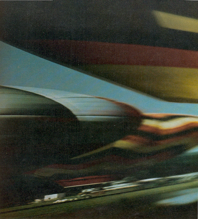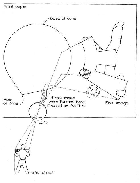 surface mirror so that the rays fall obliquely across the print paper, which is placed off to the side rather than directly under the enlarger. The result is a distorted print, similar to some anamorphic paintings, that must be viewed almost from the edge in order to re-create the proper perspective. For example, the hot-air balloons in Figure 1 are clearer if the photograph is viewed (with one eye) from a slant angle or reflected in a plane mirror held tilted at one edge of the photograph. The sequence of inversion and reversal of an image in the exposure of the photograph is the same as it is with the cone. To make the proper exposures on the anamorphic print made with a plane mirror you must adjust their duration across the width of the print paper. The areas farther from the mirror require more exposure than the areas closer to it. Stork adjusts the exposure by inserting a sheet of cardboard between the mirror and the paper. He begins the exposure with the cardboard fully blocking the light. Then he gradually withdraws the cardboard until finally the edge of the paper nearest the mirror is exposed. In this way the farther regions are exposed longer than the nearer ones. Stork cautions that much experimentation and patience are required with both a reflecting cone and a plane mirror to make a satisfactory print. The focusing is never quite right. If one part of the paper is in focus, another part will not be. Stork generally adjusts the focus for the middle of the anamorphic print or for any particularly important feature of the print. He also adjusts the f-stop diaphragm in the enlarger. A small aperture (a larger f number) gives more depth of focus. The smallness of the aperture means that longer exposures are needed because less light is reaching the print paper, but the improvement in focus is worth the extra effort. Stork also employs a shiny cylinder to reflect the light rays to the print paper. The light from the enlarger is reflected from a plane mirror and then from the cylinder before it falls on the paper. To make the light from the plane mirror fall only on the cylinder and not directly on the paper, Stork blocks off part of the light so that only the cylinder is illuminated.