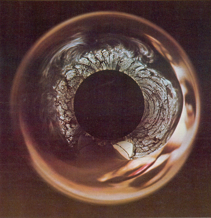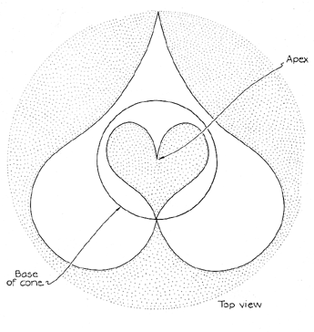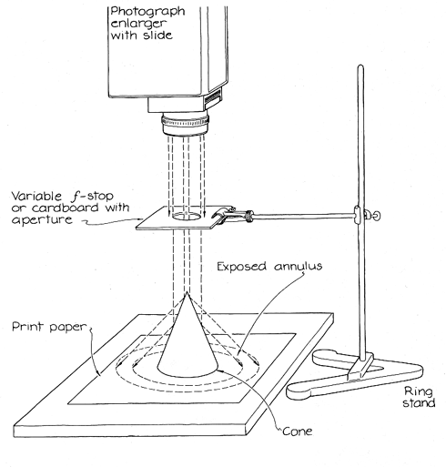 concentrated than the light that strikes the outer boundary of the paper. The time of exposure for the paper near the base is normal; for the paper near the outer boundary the time should be between 15 and 20 times longer. Stork manages to achieve approximately the right exposures by making the first one with a relatively large aperture that he has mounted on the ring stand. The aperture is either the variable f-stop diaphragm or a piece of cardboard with a large hole in it. The last exposure is made with a comparatively small aperture that confines the light to the apex of the cone. Since that region sends light toward the outer boundary of the print paper, only the perimeter of the paper is exposed. Starting with the large aperture, Stork steadily reduces the aperture size so that less of the cone is illuminated. (Either the variable f-stop diaphragm is narrowed or the cardboard is replaced with another piece having a smaller hole.) He continues until the exposed region is confined to the perimeter of the paper. It is important that in the first exposure the circle of light not extend beyond the base of the cone. If the circle is larger light can reach the area on the paper around the cone without having been reflected from the cone. The print would be ruined, since it would not be a true image resulting solely from reflection. A fair amount of practice is needed to master varying the size of the aperture and making the exposures. Beginners should work with black-and-white print paper so that experimenting with the exposures does not become too expensive. Stork recommends that when you are ready to make color prints from color slides, you work with Ilford Cibachrome color print paper. According to Stork, almost any scene will do for a color slide. A good goal is to achieve an anamorphic print that resembles something totally different from the original scene. Better prints result if the slide has a relatively dark central area. Light from that area of the slide falls: mainly on the apex of the cone. No cone, not even a machined one, will have a perfect point. Hence light reflected from the apex will be distorted in an uncontrolled way. If you could place the cone on the finished photograph exactly as it stood on the print paper during the exposure, you could undo this distortion. Such precise repositioning is arduous and not worth the trouble. Another difficulty with the apex is that the light reflected from it to the print paper is comparatively faint. You can avoid both problems by having a slide with a relatively dark central area so that what is reflected from the apex makes less differences in the print.