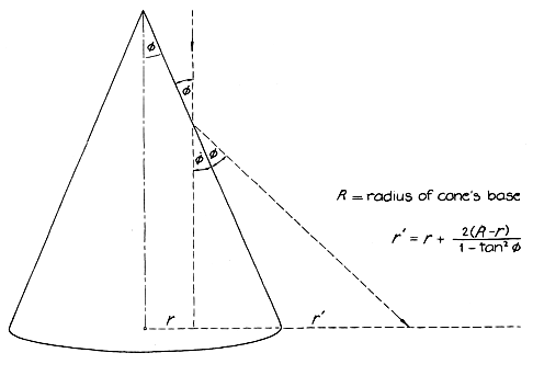 The procedure for exposing the paper is similar to that for making an exposure with a cone. In darkness Stork mounts the paper in its holder and lays on the paper a placement mask that has a semicircular cutout into which he positions the cylinder. Then he lifts the mask off the paper before he illuminates the cylinder. If the mask is shaped so that it does not block any of the light reflected from the cylinder, it can be left on the paper during the exposure. The geometry of the cone setup is simple. Consider a cone that has an apex with a known angle. I shall call the half angle of the apex phi. It should be less than 45 degrees; a half angle of 30 degrees works well. Next consider a ray of light that is initially vertical. It strikes the side of the cone at an angle to the surface that is also phi. A light ray always reflects from a surface at the angle of its approach. Therefore in the cone setup the angle between the reflected ray and the surface is also phi. Suppose the center of the cone's base is considered as being the center of a coordinate system. If the cone had not been in the way, the vertical ray would have struck the paper at a distance r from the center. With the cone in place the reflection redirects the ray so that it now strikes the paper at a distance greater than r from the center. The new distance is given by the equation in Figure 5. One can predict the appearance of the anamorphic print by plotting the new positions of each section of the original scene in the slide. With the cone displaced focus the slide on a sheet of ordinary paper. Choose a small area of the image and measure its distance r from the center point (where the center of the cone's base will be once it is positioned on the paper). Then use the equation to determine the new distance r' for that section of the scene. A simple procedure for measuring the half angle of the cone's apex is to-take the inverse sine of the radius of the base divided by the distance along the side of the cone (from the apex to the base). To map the original scene into the anamorphic one completely position a circular grid on the paper. Choose a section of the original scene that is at a distance r from the center and lies within a certain angle around the center. That area of the picture should be reproduced at a new distance r' and within the same angular extent around the center. If the new location is adjacent to the base of the cone, the new area will resemble the original area. If the new location is away from the base, the new section will appear to be stretched out along a section of a circle around the center. This procedure for mapping normal drawings into anamorphic ones has been described in these pages by Martin Gardner [see "Mathematical Games," SCIENTIFIC AMERICAN, January, 1975]. A faster way is to have a computer plot the anamorphic pattern. The input must include the coordinate positions of all the sections of the original scene: the initial radius R and the angular extent of the section, say one degree. The computer will compute the new positions and (if a plotter is attached) plot the results within one degree at the new radius. Waldo Tobler of the University of California at Santa Barbara created an anamorphic computer-graphical picture from a drawing of a woman Stork had made on graph paper. Patricia S. Irle, one of Tobler's students, entered 1,450 data points for the drawing into a Tektronix 4051 computer. The original drawing was printed out by the computer. Then the program effectively reflected the image from a cone by applying the transformation equation to determine the new distance of each point from the center of the picture. Finally the distorted picture was printed out by the computer. When Stork positions his cone at the center of the printout and peers down into the reflecting surfaces of the cone, he sees an image of the original drawing. Without the aid of the cone he would see only the anamorphic version. The same kind of transformation can be done with a home computer. If you do not have a printer, the transformation can be displayed directly on the monitor screen. Write a program that "draws" a design close to the center of the screen. The pattern will actually be composed of many small rectangular elements that are turned on by the computer. Since the positions of these elements will have to be remembered by the computer, you must store the positions of the rectangles. For each rectangle have the program apply the equation for the transformation by a cone. New rectangles, farther from the center of the screen, will be turned on. This new set constitutes the anamorphic picture. Place a cone at the center of the screen and look into its sides. In the reflections you will see a likeness of the original drawing. The reproduction is not complete because the monitor lights up rectangles, not small dots. Some of the details of a curve are lost. The rectangularity of the elements also means that the angular extent of part of the design will not be mapped faithfully at the new radius. Still, the speed of the computer makes it possible to analyze many patterns. Other anamorphic pictures can be studied if the equation for the transformation is altered. Examples can be found in the article by Andy A. Zucker listed in the bibliography for this issue. Some types of anamorphic distortion are particularly interesting. For example, Stork sent me the results of three simple drawings that had been distorted anamorphically in a cone. In one he had drawn a heart (in Valentine style). He colored the heart red and the area around it white. After the transformation what he saw was an inverted white heart with a red surround. The color and orientation were reversed because the cone exchanged the center of the sketch for the perimeter and vice versa. For another example Stork drew a "happy face": a circle with two dots for eyes and a semicircle for the mouth. The transformation results in another happy face of
