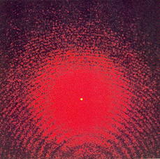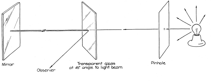 The other major principle of interference-the Fraunhofer pattern-is produced by the diffraction of light by the dust particles on the surface of a mirror coated for reflection from the back surface. To explain what is seen I shall first describe a simpler demonstration of diffraction by small particles. If you look at a small light source through a misty window, the image of the source is surrounded by concentric interference rings. They are Fraunhofer rings resulting from the diffraction of light rays by the water droplets on the window. When a beam of light passes a small particle such as a dust particle or a water droplet, the light diffracts around the sides of the particle. The diffracted rays create an interference pattern when they are intercepted by a screen after passing the particle. If the particle presents to the light an approximately circular cross section, the pattern consists of concentric bright rings surrounding a relatively bright central spot and interspersed with relatively dark rings. The bright rings are created when rays of light diffracting around the particle interfere constructively. The dark rings are caused by destructive interference. The kind of interference depends on the geometry of the rays. The difference in their path lengths causes phase differences between them. At the center of the pattern all the rays arrive in phase because they all travel the same distance. Rays arriving slightly off the center have path differences resulting in a phase difference of half a wavelength. These rays interfere destructively. Since the same condition develops in a circle around the bright center of the pattern, a dark band appears around the center. The next ring is bright because the rays interfere constructively. You see a similar pattern when you look through a dusty or misty sheet of glass, provided the light source is small enough or far enough away to occupy a small angle in your field of view. You see not the full diffraction pattern from each particle on the glass but a composite pattern encompassing parts of the pattern cast by each particle. The particles on the axis between you and the light source send the bright centers of their patterns; the particles slightly off the axis send part of their innermost dark ring. The result from all the particles is again a pattern of alternating bright and dark rings. The particles on the glass not only diffract the light into the pattern of Fraunhofer rings but also disperse the white light into its component colors so that the rings are colored. The Fraunhofer ring around the moon or the sun is called a corona. (The term should not be confused with the solar corona seen during a total eclipse of the sun.) The particles responsible for the ring are water droplets or ice crystals in the thin clouds between the observer and the moon or the sun. I can see a similar corona when condensation mists my eyeglasses or car windows. Distant streetlights and the headlights of cars are surrounded by colored rings. Sometimes I see Fraunhofer rings when distant headlights illuminate the rearview mirror in my car because my mirror is normally some what dusty! (Another kind of corona that is seen surrounding distant light sources has nothing to do with the diffraction I am discussing. This faint "entoptic corona" is created in the observer's eye.) I once saw a remarkable example of the diffraction pattern when I was about a meter away from a misty mirror that was illuminated by bright light from a window some five meters behind me. Superimposed on each of my eyes in the mirror was a Fraunhofer pattern.