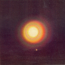 Both patterns require a mirror with the reflecting surface on the back, which is the case with ordinary glass mirrors. The pattern that is always centered on the reflected image of the light source is usually called the Fraunhofer pattern. It has been thoroughly studied, not only because it affords an excellent demonstration of optical diffraction but also because the interference is responsible for the colored ring occasionally seen close to the moon or the sun. The other interference pattern that can be seen in a dusty or misty mirror was studied intensely in the 1 9th century but has been virtually forgotten since then. I shall begin my story with this less familiar interference. Then I shall return to the Fraunhofer pattern and the lunar or solar ring. Isaac Newton was apparently the first to study colored interference patterns in a dusty mirror. He made a shaft of sunlight fall on a pinhole in a screen in front of a hemispherical concave mirror. Light passing through the pinhole was reflected from the mirror and returned to the pinhole because it was positioned at the center of curvature of the mirror. The interference pattern appeared on the screen around the pinhole. The irony of much of Newton's work in optics was that he discounted the possibility that light consisted of waves. Holding fast to the notion that light consisted of particles, he failed to explain any of the demonstrations of interference he investigated, including the one with the dusty mirror. The proper understanding did not emerge until Thomas Young convincingly demonstrated the wave nature of light. He explained briefly the colors that could be seen in Newton's dusty mirror. Later work on the pattern was done with flat mirrors by William Whewell in England and by Lambert Adolphe Jacques Quetelet in Belgium; as a result the pattern is now known as the Whewell-Quetelet interference pattern. Almost any small particles-room dust, chalk dust, lycopodium powder-on a mirror can generate the Whewell-Quetelet pattern. The moisture that condenses when you breathe on the mirror will do. You can also create a thin layer of dried milk globules. Mix one part of milk with three parts of water and coat the front surface of a mirror. Tilt the mirror so that the excess liquid runs off. Allow the remainder to dry. The milk globules left on the mirror serve in the same way as the dust particles. The dusty material does not have to be directly on the mirror. Sir John Herschel demonstrated the interference pattern by tossing wig powder into the air in front of a mirror. The interference pattern depends on the scattering of light by the particles on the mirror or just in front of it. For the sake