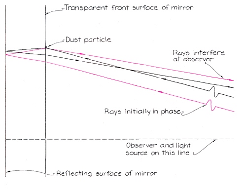 In nearly all standard examples of interference the numerical labels for the bright fringes increase with distance from the center of the pattern. The interference pattern from the dusty mirror is an exception, at least in principle. If the bright rings still farther from the center of the pattern could be seen, their order would begin to decrease. The reason is that when two rays return to the observer from a point relatively far from the perpendicular line, they have traveled almost equal distances. The phase difference between them is therefore smaller than the difference between the rays of another pair scattering from a particle somewhat closer to the line. Unfortunately the rings where the numerical sequence reverses cannot be observed in an ordinary mirror. The width of the interference rings also varies with distance from the center of the pattern, narrowing at first and then (too far from the center to be observed normally) widening. The width of a ring for any particular order of interference depends on several factors. The ring is larger for a longer wavelength, for a larger index of refraction of the glass in the mirror and for a thinner mirror. The width also depends on the relation between the distance of the light source from the mirror and the distance of the observer from the mirror. Why do a pair of rays participating in the creation of an interference pattern scatter from the same particle? A ray from one particle could interfere with a ray from another, but the interference would not contribute to a composite pattern. The scattering of light from a particle causes a shift in the phase of the light that depends on the size and shape of the particle. If two rays scatter from the same particle, the phase shift is the same. The phase difference then depends only on the geometric relations of the light source, the observer and the particle.
