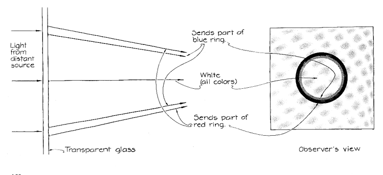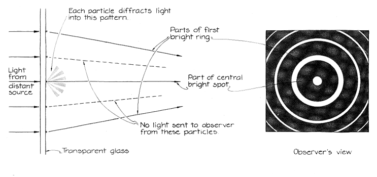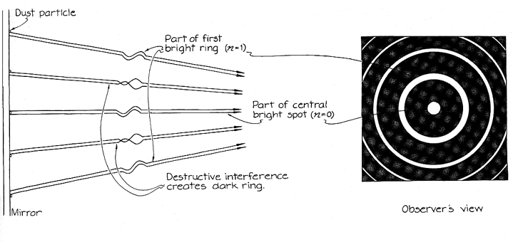 of simplicity I shall assume that the observer and the light source are on the same perpendicular line from the mirror and that the light from the source consists of only one wavelength. Later I shall discuss interference arising from white light and explain how the colors are dispersed. Suppose two rays travel to the mirror from the source as part of one wave front. They are coherent (the light waves of the two rays are in phase) and nearly parallel. Although the light source is incoherent (unless it is a laser), it does emit coherent waves in short bursts over short distances. One ray scatters from a particle toward the back of the mirror, is reflected and travels to the observer. The other ray enters the mirror without scattering from the particle, is reflected, then scatters from the same particle and travels to the observer. Although the rays were initially in phase, the phase relation now depends on the lengths of the paths they have taken. If the paths are exactly the same length, the rays are once more in phase and they interfere constructively The observer sees relatively bright light from the position of the particle on the mirror. When the observer and the light source are on the same perpendicular line from the mirror, this situation results with a particle directly in front of the observer, that is, at the foot of the perpendicular line. A particle slightly off the line sends the observer rays with a different phase relation. If the difference in path lengths results in a phase difference of half a wavelength, the rays interfere destructively. The observer sees a dark spot. Moreover, because of a circle of dust particles around the perpendicular line where the geometry is correct for destructive interference the observer also sees a dark ring around the perpendicular line. It is the centermost of the dark rings in the interference pattern. Particles a bit farther from the center of the pattern scatter pairs of rays that end up a full wavelength out of phase when they reach the observer. The result is constructive interference and a bright ring. More bright and dark rings are seen somewhat farther from the line. They are caused by progressively larger differences in the path lengths of pairs of light rays. Interference patterns are normally labeled according to the phase difference between the participating rays. The bright place at which the phase difference is zero is labeled n = 0 and is called the zero-order fringe of constructive interference. In the geometry of observer and light source I have described, this fringe is at the foot of the perpendicular line. The next bright fringe, where the phase difference is a full wavelength, is labeled n = 1 and is called the first-order fringe of constructive interference. It is the central bright ring in the interference pattern.