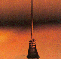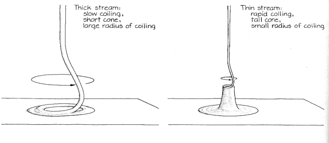The first study of these phenomena was made in the late 1950's by George Barnes, who is now at the University of Nevada at Reno, and two of his students, James MacKenzie and Richard Woodcock. They worked with a heavy oil (No. 140 transmission oil) that they poured into a dish. When the stream was circular in cross section, it coiled on reaching the pool. When it was fairly flat because it had been poured over an edge, it resembled a folded ribbon. If the stream fell onto a surface that was not horizontal, it formed a figure eight or a petal-like figure. The frequency of coiling depended on the height from which the stream fell, being larger with a greater fall. This relation was linear for long distances but more complicated for short ones. A certain minimum fall was necessary. If the fall was less than the minimum, the fluid entered the pool without coiling. When the fall was more than the minimum, the stream reached the surface at a rate of speed higher than the rate at which the pool could absorb it, and so it began to form a coil. When the stream fell quite far, the coiling generated a cone of oil that rose slightly above the surface of the pool. A stream that coiled quickly usually resulted in a relatively high cone, although the height was never more than a centimeter. A cavity formed at the top of a tall cone as the stream coiled there. Barnes observed that a given particle of oil in a falling stream does not spiral around the central axis of the stream but instead is confined to a vertical plane. As the particle approaches the region of coiling it moves to the side and off the central axis before continuing on to the surface of the pool. Barnes tried to follow the motion of individual particles of fluid by inserting particles of aluminum into the stream, but the motion of the particles was too swift to monitor. Barnes then directed the light of a stroboscope at the stream. When he matched the frequency of the flashing to the coiling frequency of the stream, each flash illuminated the stream at the same phase of coiling. To Barnes the coil appeared to be stationary. If the frequency of the stroboscope was slightly out of synchrony with the coiling rate, the coil appeared to turn slowly. Barnes could monitor a rapidly turning coil by effectively slowing it in this way. The next investigation of liquid coils was made by Geoffrey Ingram Taylor, one of this century's leading investigators of fluid dynamics. He attributed the coiling to mechanical stress in the viscous stream as it approached a pool of fluid at fairly high speed. The fluid in a stream increases in speed as it falls because of the acceleration of gravity. The stream also becomes narrower. Both effects figure in Taylor's explanation of coiling.