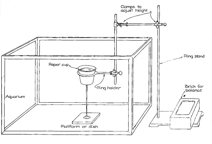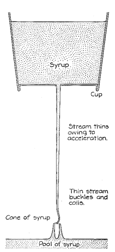 Taylor also made a stream of glycerin fall through two layers of fluid, each layer less dense than the glycerin. The stream coiled as it passed from the first layer into the second. The first layer had the smaller specific gravity, as was ;- shown by the fact that it floated on the second layer. Thus the acceleration of a.- the stream was larger in the first layer than it was in the second. If the change in acceleration at the boundary between layers was sufficiently large, the stream was stressed as it crossed the boundary. If the stream was sufficiently thin at that point, it buckled and coiled as it descended through the bottom layer. Once a stream begins to coil, its downward speed changes. The ratio of the two speeds depends on the diameter of both the stream and the coil. The ratio is equal to the diameter of the stream divided by the product of pi and the diameter of the coil. In my investigations of the coiling of viscous liquids I set up a ring stand to hold a paper cup inside an aquarium. Below the cup was a small plastic platform onto which a fluid stream fell from a hole in the bottom of the cup. The platform was convenient when I photographed the coiling stream because the draining of the fluid off the platform ensured that the coils would always be at the same height above the bottom of the aquarium. I made the hole in the cup with the point of a pencil; I tried to make the hole smooth on the inside of the cup so that small flaps of paper would not alter the flow of the fluid. The diameter of the hole was about four millimeters. The cup, which I set snugly in a ring clamped to the stand, could be raised or lowered by adjustments of the clamps. I started with Karo dark corn syrup. The stream of syrup fell through air and onto a shallow pool of syrup on the platform. The height of the fall was the distance between the platform and the top surface of the syrup in the cup. (Because of the fluid pressure on the syrup at the bottom of the cup a particle of syrup going through the hole has the same speed it would have had if it had fallen :from the top surface of the syrup.) When the height of the fall was between seven and 13 centimeters, the stream coiled as it hit the pool. With a shorter fall there was no coiling. With a longer fall the syrup emerged from the cup in spurts. Each spurt displayed some coiling or a more complex twisting, but there was no sustained coiling and no cone. When the fall was fairly long, the stream was quite thin just above the E platform and quickly built up a cone that extended about a centimeter above the platform. At the top of the cone the coiling of the stream was too fast for my eye to follow. The coiling could be in either direction, but once it started it would not reverse. When the fall was shorter, the stream was relatively thick just above the pool. No cone developed and the rate of coiling was slow. The horizontal extent of the coiling also depended on the height of the fall. In a long fall the stream extended to the sides only a few millimeters; in a short fall it extended about a centimeter. I partially filled the aquarium with tap water and repeated the-experiments. The syrup fell through the air and then through the water. The fall was relatively long, so that the coiling was fairly fast, although the rate was lower than it was when the syrup fell only through the air from the same height. The cone in the pool of syrup was considerably less well defined than it was in the preceding demonstration because the coiling was more erratic. I increased the specific gravity of the water by stirring in salt. The acceleration of the stream through the salt water was less than it was through the tap water. After leaving the salt water undisturbed for a long time I repeated the experiments. The coiling frequency was somewhat less than it was in the tap water. Again the coiling and the formation of the cone were not well defined. With strong back lighting on the impact area I saw the circulation of the salt water created by the coiling. Vortexes shed by the coiling made the salt water first swirl away from the cone and then move upward and back to the falling stream of syrup. With a considerable distance between the cup and the surface of the water the syrup fell from the cup in bursts. The lower end of each burst was a fat glob of syrup, followed by a thinner stream that eventually broke away from the hole. When the stream entered the water, it formed quite complex shapes. The glob hit the bottom first and sent a shock through the thin stream, which stretched, twisted and turned, even occasionally bouncing from the pool of syrup. In a short time the stream slowed and merged with the pool. In another experiment l poured a layer of transmission oil over the salt water. When corn syrup was poured into the aquarium, it passed through air and then through the transmission oil, entraining some of the oil. When it descended into the salt water, it had a much greater diameter because of the added oil. The stream coiled very slowly at the bottom.