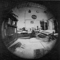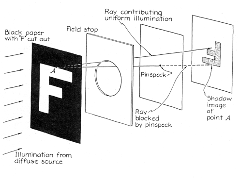The assembly of the brass sheet and the shim can be mounted on virtually any type of light-tight box. I have seen pinhole cameras made with cereal boxes. Working in a darkroom, the photographer mounts a piece of photographic paper at the back of the box and slides on the lid. A piece of black tape is put over the pinhole to prevent light from entering the box prematurely. When everything is ready, the tape is pulled back from the hole for the exposure and then put back over the hole. Although such a camera functions as a pinhole camera, it has two disadvantages: only one photograph can be made before the camera is returned to the darkroom, and the removal and repositioning of the tape might shake the box too much, blurring the photograph. I chose to follow a procedure outlined by Young. On the base of his 35-millimeter camera he mounted an extension tube, which is available for most cameras with removable lenses. At the outer end of the tube he attached his pinhole assembly. Lacking an extension tube, I used a cardboard mailing tube that I attached to my camera base with several layers of black tape. The advantage of this type of pinhole camera is that an entire roll of film can be exposed. Since my camera is a single-lens reflex model, I could actually see a dim image of the scene I was to photograph before I made a picture. Whereas in pinhole photography light passes through a hole to create an image, in Cohen's pinspeck photography a pinspeck casts a negative image of an object. His setup is the optical complement of the pinhole. The screen and hole are replaced with a small obstacle of circular cross section. Now all the light that would travel through a pinhole is blocked. All the light that would have been blocked by the screen reaches the film, forming a negative image. The final pinspeck photograph is similar to the pinhole photograph except that bright and dark areas are exchanged.
