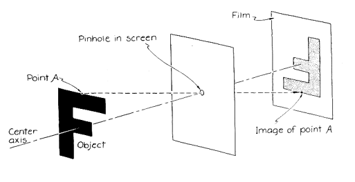 Pinhole photography relies on the passage of light through a small hole in an opaque screen. The light falls on a piece of film to construct an image of the object being photographed. Images from pinholes were mentioned by Aristotle, explained in principle by Leonardo da Vinci and analyzed formally by Lord Rayleigh. Simplicity is only one of the advantages the pinhole camera offers over a camera with a lens. When an object is photographed with a pinhole camera, each point of the object facing the camera casts a corresponding spot of light onto the film (or photographic paper). The composite of the spots is the image recorded by the film. If the image is to be clear, the adjacent spots should not overlap. Therefore they should be as small as possible. Part of the design of a pinhole camera lies in choosing a size for the pinhole and a distance between the hole and the film that will make the individual spots of light cast on the film remain discrete and as bright as possible. In principle the pinhole can be of unlimited size. The larger it is, however, the farther it must be placed from the film and the larger the film must be, so that in practice the size of the hole is limited. There is also a theoretical limit on how small a pinhole can be. Consider a camera in which the pinhole is a reasonable distance (several centimeters) from the film. Suppose the pinhole is relatively large (too large for the distance to the film) and the camera faces a distant point source of light. The rays of light from the source arrive at the pinhole essentially parallel to one another and to the central axis that passes through the hole and is perpendicular to the screen. The radius of the circular spot of light cast on the film is equal to the radius of the hole. Since the pinhole is large, the spot of light is large. If many point sources of light were being photographed, the spots on the film would overlap and the individual point sources would not be recognizable. The size of the spot of light from a single point source is reduced if the size of the pinhole is reduced. The scope of this improvement is- limited, however, because eventually the pinhole is so small that the light passing through it diffracts into an interference pattern. A point source of light creates not a single small spot of light on the film but a circular pattern consisting of one central bright spot surrounded by dimmer rings. If the size of the pinhole is reduced further, the diffraction pattern gets larger, with a resulting loss of resolution in the photograph. The optimum radius for the pinhole is related to the distance between the hole and the film. The relation can be shown by