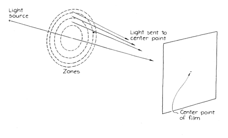 a theoretical argument that depicts light as being in wave form. Imagine that the pinhole and the screen have been removed. A light wave from a point source travels through the plane formerly occupied by the screen. Consider a family of circular zones on that plane and concentric on the camera's central axis. The zones are distinguished by their path lengths to a point at the center of the film that is also on the central axis. The distance between the central zone and the center point on the film is the distance that was between the pinhole and the film. The second zone is farther from the center point by half a wavelength of light, the third by an additional half wavelength and so on. All the zones send light waves to the center point, but because of the differences in the path lengths the waves interfere when they arrive. For example, the wave from the second zone arrives half a wavelength out of phase with the wave from the central zone. If the amplitudes of the two waves were equal, the waves would cancel each other. Indeed, if all the contributions were equal in amplitude, they would all cancel at the center point. In reality, however, the amplitudes are not equal, as is shown in descriptions more precise than those I can supply here, so that the cancellation is only partial. The net amplitude of the light wave at the center point turns out to be half the amplitude the central zone would have contributed on its own. Because the brightness of the light is related to the square of the amplitude this result means that the brightness at the center point is a fourth of what it would be if only the central zone were contributing light. One of the purposes of a pinhole is to block all the zones except the central one. (Some investigators say it blocks all but the first two zones.) A pinhole of optimum size allows only the central zone to send light to the center point on the film. With a pinhole of that size the spot of light at the center point will be bright and small with a good distribution of light. If the pinhole is smaller than this optimum size, only part of the central zone contributes light at the film. The spot of light is dimmer and the distribution of light is poorer. If the pinhole is too large, the additional zones in it decrease the brightness of the spot and increase its size. What one seeks, then, is not a particular size of pinhole but rather a particular relation between the size of the pinhole and the distance from the hole to the center point on the film. When an object to be photographed is relatively distant, the optimum radius of the pinhole is approximately equal to the square root of the product of the wavelength of the light and the distance between the pinhole and the film.