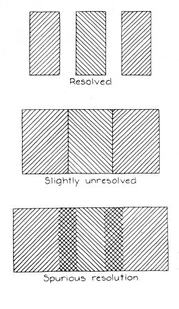 Assume for the sake of demonstration that the final photograph is the same size as the film and that it will be viewed at a distance equal to the distance between the pinhole and the film. You are to photograph two adjacent point sources of light whose angular separation is at the limit of resolution (.001 radian) of your eye. The camera should cast two spots of light on the film that barely touch or overlap slightly. When the photograph is viewed, you will just be able to resolve the spots. The angle. between the spots in your field of view can be calculated by dividing the diameter of the pinhole into the wavelength of the light. Suppose the wavelength is 500 nanometers (about in the middle of the visible range). If the angle for the limit of resolution is .001 radian, the pinhole's radius should be .25 millimeter. Once this choice has been made the optimum distance between the pinhole and the film can be calculated (by the relation I have already set out) to be 12.5 centimeters. If you made the pinhole twice as large and adjusted the distance of the film from the hole accordingly, the resolution of a photograph from the camera would be twice as good. If the size of the photograph and the distance at which you view it are unchanged, however, you would not be able to see the improvement. Moreover, the camera would now be 50 centimeters long (in order to have the proper distance between the pinhole and the film) and larger film would be needed to capture all the light from the pinhole. Clearly the improvement is not worthwhile. When the pinhole is larger than it should be, the poorer resolution can actually add erroneous detail to the photograph. This effect, called spurious resolution, results from the overlap of the images from several adjacent objects. Young's demonstration of the spurious resolution of three vertical bars appears in the illustration below.