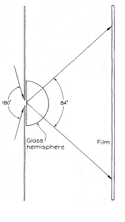 For several reasons the intensity of the light cast on the film is nonuniform. Suppose two point sources of light are being photographed, one on the central axis and one off it. The light from the off-axis point source encounters a pinhole that is effectively elliptical. Therefore less light travels through the hole from the off-axis source than from the point source on the axis. In addition the light forming the off-axis spot must travel farther to reach the film and so spreads more, thereby arriving at the a film with less intensity. Moreover, this light reaches the film at an angle that further spreads the exposure over more of the film, reducing the intensity even more. These losses over the width of the film establish a practical limit to the field of view. Another limit to the field of view is that an object sufficiently off the central axis may not reflect light to the film unless the film is quite wide or fairly close to the pinhole. The usual solution to the problem has been to move the film closer to the pinhole so that a wide-angle ,a photograph can be made. The trouble is that this stratagem reduces the resolution of the photograph because the film is no longer at the right distance from the pinhole for optimum resolution. Another way to increase the field of view is to design a film holder that is hemispherical with respect to the pinhole. Then any light entering the pinhole, even light from an object that is almost 90 degrees off the central axis, will reach the film. Another result would be less of a decline in the exposure far from the center of the film because the light would always strike the film perpendicularly. The resolution of the objects off the central axis would also be improved, since all sections of the film would be at the same distance from the pinhole. Unfortunately a hemispherical film holder is not very practical. A cylindrical one might be an adequate compromise. Another solution to the problem was invented by John M. Franke of the National Aeronautics and Space Administration's Langely Research Center. Franke positions a glass hemisphere just behind the pinhole of a camera in which the film is held in a normal flat plate. As the light passes through the pinhole and into the glass it is refracted. The full field of view, which occupies an angle of 180 degrees, is reduced to a cone of light occupying an angle of 84 degrees. When the light emerges from the glass, it is perpendicular to the surface of the glass. Hence the angle of the cone of light is unaltered. The reduction in the angle from 180 to 84 degrees enables Franke to position the film at an appropriate distance from the pinhole and still make a wide-angle photograph with a field of view of approximately 180 degrees. Franke's glass hemisphere is made from BK-7 glass and is 25.4 millimeters in diameter. Its index of refraction is about 1.5. The diameter is not critical, but different results are obtained with glass that has a different index of refraction. You might like to experiment with other glasses or even with plastic of good quality. If you want a field of view of 180 degrees, you will encounter some distortion of the image toward the edges of the photograph.