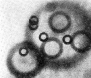 The image cast by Cohen's pinspeck does not depend on the diffraction of light because the pinspeck is too large to give rise to a significant diffraction pattern. The image is created by the simple blocking of light rays from the object. Any particular spot on the film records the shadow of a section of the object lying on a straight line extending from the spot through the pinspeck and to the object. A photograph made with a pinspeck displays poorer contrast than a pinhole photograph because the pinspeck arrangement allows nearly all the light from a scene to reach the film. Most of it is a uniform illumination that is of no value and merely reduces the contrast of the image. It is the remainder of the light, the nonuniform portion, that carries the information about the object. Contrast would be improved if somehow the uniform illumination were diminished or the proportion of the nonuniform light carrying the information about the object were increased. The variation of light can be increased u if the pinspeck is positioned closer to the film, but just as with pinhole photography this arrangement decreases the resolution of the photograph. Cohen says he does sacrifice some of the resolution to achieve enough contrast in the photograph to create a recognizable image. Some of the uniform illumination results from parts of the scene that are not important to the photograph. To decrease this unimportant illumination Cohen places a field stop (a screen with a hole larger than the pinspeck) in front of the pinspeck. The hole is large enough for the extreme parts of the object to illuminate the edges of the film but small enough to prevent the rest of the scene from reaching the film. The coloring of pinspeck images can be strange. If a small collection of colored objects is photographed, the image of each object will probably be of a different color from that of the object. The change depends on the combined colors of the objects in the collection. If the combination is white, each color in the collection is switched to its complement in the photograph. For example, a red object will form an image in a color that is the subtraction of red from white (be cause the pinspeck blocked the red from the object). Therefore the color of the shadow is cyan, the complement of red. Correspondingly, a green object creates a magenta shadow. Some of the properties of a pinhole camera are displayed equally well by a pinspeck camera. The field of view is large, the adjustment to the magnification of the camera is made by changing the distance between the pinspeck and the film, and there is no linear distortion Astigmatism can be avoided with a pinspeck camera if the pinspeck is spherical. Then any light traveling from the object to the film intercepts an obstacle with a circular cross section even if the object is well off the central axis of the camera. One other difference in the two types of photography is that a series of pinholes aligned between the object and the film will not produce a photograph but a series of pinspecks will. The screens perforated with the pinholes keep the light from falling on the succession of pin- holes closer to the film. In contrast the pinspecks barely interfere with one another's ability to form an image of the object. The illustration at the bottom left is a photograph Cohen made from a series of pinspecks that he positioned between a single bright ring and the film. Each pinspeck produces its own negative image of the ring. If you would like to make pinspeck photographs, Cohen offers the following suggestions. For a pinspeck place a dot of black paint on a piece of clear glass or acetate. The shape of the dot is not critical. Instead of paint you could paste on a small circular dot. (I find such dots in office-supply stores. They are for labeling purposes.) Cohen recommends that the dot not be too small or the contrast in the photograph will be too low. The scene photographed should have high contrast so that the photograph will also. You could begin your experiments with pinspeck photography by cutting figures in a black, opaque sheet of paper and then illuminating the sheet from behind with a diffuse source of light. Much more can be learned about pinhole and pinspeck photography than I have set out here. A description of Cohen's work will appear soon in Optica Acta under the title of "Anti-pinhole Imaging." Some of the most thorough work on pinhole photography, both experimental and theoretical, can be found in a series of papers by Connors in Interest, a journal he edits. It is available from him at the School of Pharmacy, University of Wisconsin, Madison, Wis. 53706. His recent papers have dealt with the conditions for optimum resolution and definition, the calibration of a camera for contrast control and the relation between a pinhole camera and the optics of a zone plate. Bibliography PINHOLE IMAGERY. M. Young in American Journal of Physics, Vol.40, No.5, pages 715-720; May, 1972. FIELD-WIDENED PINHOLE CAMERA. John M. Franke in Applied Optics, Vol. 18, No. 17, pages 2913-2914; September, 1979.