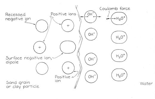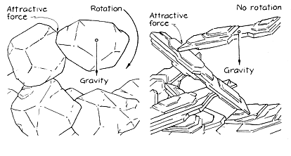 On the surface of a clay particle positively charged sites are exposed, just as they are on a sand grain. According to the older ion model of wet clay, OH- ions adhere to these sites, leaving H3O+ ions in the water between the clay particles. The strength of the wet clay is due to the attraction between the two sets of ions. In the more modern model of wet clay the water is said to be immobilized by the electric fields set up by the positively charged sites on the clay particles. As with the model of wet sand, the immobilized water has a high viscosity. The wet clay is firm because the clay particles cannot flow over each other. If the clay is very wet, it is not firm. The water away from the particles is less viscous and can flow. Drying clay differs from drying sand in an important respect. Whereas the charges on a sand grain can shift and give rise to a Helmholtz double layer on the surface of the grain, the charges on a clay particle cannot. The clay particle is too thin in one dimension for double layers to form on the opposite sides of that dimension. The innermost layers of charge (which would be of the same sign) would repel each other too strongly to be stable. When wet clay dries, the fact that a Helmholtz double layer cannot form requires that the particles retain their diffuse double layer and that the resulting viscous water remain between them. The clay structure continues to be firm. In fact, its rigidity increases as the particles move closer to one another, further increasing the immobilization of the water. As the structure shrinks and more contact points develop between the particles, the particles bond together by sharing ions. They also resist movement because of the remaining viscous water. Other forces, all electric, also help to bond them together. Sand grains are closely packed. Clay particles are loosely packed. Their packing differs because of the difference in their shapes and sizes. Suppose a sand grain falls and comes in contact with a stationary grain. Does the fallen grain remain attached to the other grain or does it roll or slide over the other grain and continue its downward motion? At the region where the grains come in contact the attractive forces are strong enough to hold them together. The gravitational pull on the fallen grain, however, puts a torque on it that tends to rotate the grain about its point of contact with the other grain. Some of the attractive forces create a torque opposing the rotation. Because the grain is relatively heavy the torque due to gravity overwhelms the torque due to the attractive forces, and the grain rotates. Continued motion of this kind finally brings the grain downward into the other grains until it is closely packed. When a clay particle falls onto a collection of other clay particles, it is subject to attractive forces on encountering a