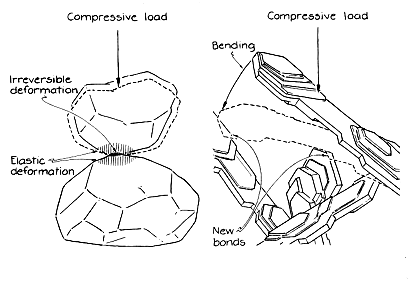 stationary particle. Gravity continues to pull it downward, creating a torque that tends to rotate it about the point of contact. The particle is so light, however, that the torque created by gravity cannot accomplish the rotation. Hence the particle remains in the orientation it had when it first collided with the stationary particle. When more particles fall, they too go no farther once they land. As a result the packing of the particles is loose. When wet or dry sand is compressed, it takes a different form only if the sand grains slide relative to one another. Suppose a pressure is applied to wet sand but not enough to cause relative motion of the grains. The contact area of two grains that are pushed against each other increases, and so does the extent of the electric forces holding them together. At the center of the contact area the additional pressure on the grains irreversibly deforms their surfaces. The energy expended in the deformation cannot be reclaimed when the pressure on the grains is removed. Mast of the energy of the compression of the grains, however, goes into deforming the region surrounding the center of the contact area, which is not irreversible. That energy is stored as elastic potential energy, much as energy is stored in a compressed spring. When the pressure on the grains is removed, the elasticity of the grains pushes them apart. The additional electric forces that are developed during the time of increased contact between the grains are relatively weak and are easily broken by the rebound of the grains. Hence after the pressure is removed the grains return to their earlier form. Something different happens when wet clay is compressed. Consider the loose collection of clay particles shown in Figure 5. The applied force bends one of the platelike particles so that its previously free end is now touching another particle. At the point of contact attractive forces bond the two particles together. When the applied force is removed, the particles remain bonded because the bonding forces are strong enough to hold the particles in their bent configuration. When you push with your fingertips against wet clay, you compress the ; structure. It does not rebound when you stop pushing. Such material is said to be plastic. Wet clay is plastic and wet sand is not. The best type of sand for building a sand castle is sand with a little clay mixed into it. Choose sand near the water so that it is already wet enough. Sand right at the edge of the water is probably too wet to be firm. Besides, any sand castle built there would soon be destroyed by waves or the tide. You can build sand castles in several ways. Wet sand can be dumped carefully from a container so that the shape of the container's interior is preserved. An interesting container leads to interesting designs. The sand can also be shaped by packing it between two lengths of board. Long castle walls are easily constructed in this way. A more difficult technique is sculpture. Heap up a large mound of sand and then, starting at the top, whittle away. Another technique mimics the growth of stalagmites in caves. From a clenched fist filled with wet sand allow a small stream to dribble out. The stream creates a thin spire that resembles the steeple of a futuristic cathedral. If your castle is to last throughout a hot day, you should periodically spray it in order to preserve its firmness. The added water seeps between the grains. There the electric fields from the grains shift the average positions of the hydrogen protons in the water and so immobilize the water. The increased viscosity of the water ensures the structure's stability until the next spraying is needed.