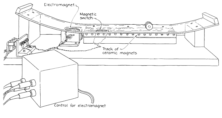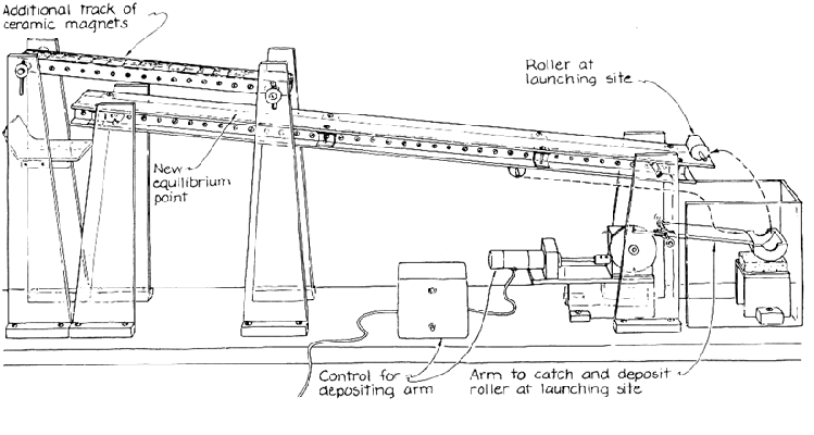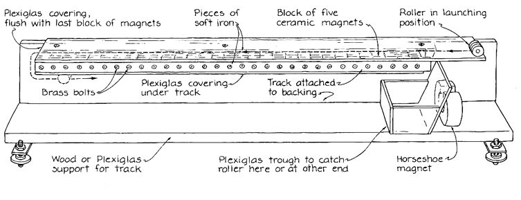 Monus has added two more features to this basic structure. First, to protect the base from the impact of a falling roller he sometimes rigs up a Plexiglas container to catch the roller. The container can be at the far end of the track from the launching section, in which case it catches a fast roller that does not return along the bottom of the track. Alternatively the container can be at the near end of the track under the launching section, in which case it catches a slow roller that does return along the bottom of the track. Second, he has positioned a horseshoe permanent magnet on the base just under the launching section, partly to help the roller returning along the bottom of the track fall off at the end of its run. Monus has experimented with this additional magnet in order to establish the right initial speed for the roller. He has also experimented with the initial distance between the roller and the first block of ceramic magnets. A greater distance means that the roller goes down the track too fast and falls off without returning. A lesser distance means that the roller rounds the far end and returns to the launching end along the underside of the track. A small distance means that it returns on the top side. This type of simple magnetic motor need not be horizontal. When the far end of the track is elevated, progressively larger accelerations are needed in the initial launching to get the roller to the far end. Monus has designed another kind of motor to help the roller climb the tilted track. Above the far section of the track he has mounted another track of ceramic magnets, made the same way the main track is and having the same orientation. The function of the second track is to shift the equilibrium point away from the midpoint of the main track toward the far end. As a result the roller accelerates longer on the main track and goes farther before it begins to slow down. It can now climb a modest slope. Monus says the positioning of the additional track is critical. He mounts it with brass bolts that run horizontally through slots in the supporting pillars of Plexiglas. By adjusting the position of the bolts in the slots he finds the optimum separation between the two tracks and the best angle for the additional track.