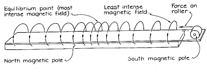The horizontal propulsion is the result of the interaction of the roller's magnetic field with the change in the magnetic field through which the roller passes. Magnetic fields are often depicted with field lines. A stronger magnetic field is depicted with a denser collection of lines. The roller begins its trip in a region where the field lines are relatively far apart and is pulled into regions where the lines are progressively closer together. This gradient of field lines (representing the strength of the track's magnetic field) provides the force for the acceleration of the roller. When the roller passes over the first block of ceramic magnets, it continues to accelerate as the magnetic field of the track propels it. At the midpoint of the track the propelling force diminishes and then vanishes. The roller does not stop, however, because of the momentum it has by the time it reaches the equilibrium point. Overshooting that point, it continues toward the far end of the track. The magnetic force on it now is opposite to its motion, and it gradually slows down. Suppose the Plexiglas extends beyond the far end of the track. The roller moves out beyond the last block of magnets before it is brought to a stop by the magnetic force. Just how far it moves beyond the last block depends on how much energy it loses during its travel. If the loss is insignificant, the roller moves as far beyond the last block as it was ahead of the first block on launching This behavior, of course, is due to the conservation of energy. The roller has a certain amount of potential energy when it is placed in the magnetic field of the track. As the track's magnetic field accelerates the roller the potential energy is gradually transformed into kinetic energy, although the total energy of the roller remains the same.