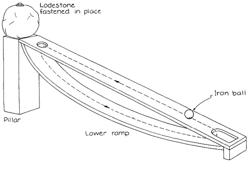 When everything is properly adjusted, the roller rounds the far end of the tilted main track and returns along the underside to the lower end. As the roller descends it gains speed. In this motor the Plexiglas sheet mounted under the track extends slightly beyond the end of the track. Because of this additional length and because of the gain in speed from the descent the roller falls off the end o f the track. Here there is an apparatus to catch the roller and return it to its starting position. The roller is caught in a Plexiglas bucket covered with plastic foam to protect it from the impact of the falling roller. The bucket is mounted on a pivoted arm actuated by an electric motor. When the roller falls into the bucket and depresses it, the arm is rotated upward, depositing the roller on the launching section. The entire journey up the tilted track and down along the underside is repeated. The motion continues as long as the arm driven by the electric motor redeposits the roller on the launching section. This kind of apparatus, like other motors designed by Monus, immediately suggests "perpetual motion." Actually, of course, the motion continues only because the motor-driven arm lifts the roller back to its launching position. Continuous cycling of the roller could not be achieved without such an input of energy. In 1570 Johannes Taisnierus, a Jesuit priest, believed a similar apparatus he had designed would run perpetually. In his scheme a lodestone (a piece of magnetic mineral) is mounted at the top of a pillar to which a ramp runs from the ground. An iron ball is placed at the bottom of the ramp. If the magnetism of the lodestone is strong enough, it pulls the ball up the ramp. Near the top of the ramp the ball comes to a hole, falls through it and is returned by another ramp to its starting point. Taisnierus believed the cycle would be repeated forever. Of course, even if the lodestone were strong enough, frictional losses and others would soon bring the iron ball to a halt.