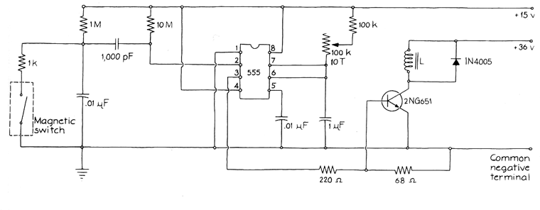 Monus has investigated the losses in his type of motor with a horizontal track of magnets to which he has added Plexiglas curved upward at both ends. At one en] of the track he placed an electromagnet. Along the track he mounted a magnetic switch that would send current to the electromagnet. When the roller passes the switch, there is a brief delay and then the electromagnet is turned on. Therefore the electromagnet is energized just as the roller approaches the end of the track. Although the magnetic field of the track and the pull of gravity are both acting to slow the roller at that point, the pull of the electromagnet is strong enough to keep the roller moving up the track. Without this additional pull the roller would merely roll back and forth over the track until it had lost all its kinetic energy. The purpose of the electromagnet is of course to supply the additional energy on each cycle. Monus adjusts the amount of current available to the electromagnet to match the energy the roller loses during a cycle. As a result the roller keeps going indefinitely. By measuring the current to the electromagnet he measures the losses of the system. The circuit for the magnetic switch and the electromagnet is shown in the lower illustration above. Two voltage sources (of 15 and 36 volts respectively) are needed. Their negative terminals are connected to a common ground. The potentiometer is critical to the success of the circuit. Monus has installed one that has 10 turns (it is identified by the 10 T in the diagram). This resistor controls the electromagnet. If the field from the electromagnet is too weak, the motion of the roller soon damps out. If the field is too strong, the roller is pulled so vigorously by the electromagnet that it bangs into the stop at the end of the track. The most amusing of Monus' motors is one in which the roller travels over a horizontal track of permanent magnets laid out in the approximate shape of a horseshoe. The track consists of three main sections. The first is a short, straight length in which the magnets are mounted as they are in the linear motors I have already described. The second section is semicircular. The third section is an electromagnet triggered by a magnetic switch on the semicircular section. Over all these magnets is a sheet of Plexiglas. The roller is released a few inches from the starting end of the first section. As in the linear motors it accelerates onto the track, overshoots the equilibrium point and continues past the last block of magnets in the straight section. There it is pulled onto the curved track. Again it accelerates toward the equilibrium point of the section, overshoots it and emerges from the other end of the section. Before the roller has a chance to be pulled back onto the curved track it rolls over the electromagnet triggered by a magnetic switch on the track. The pulse of current to the electromagnet creates a magnetic field and by that means pulls the roller toward the electromagnet. This pull also supplies fresh energy to the roller, adjusting for the energy it lost as it traveled. The roller overshoots the electromagnet, which loses its field as the pulse of the current shuts off, and continues on out across the sheet of Plexiglas. As it does so it is pulled over toward the first section of track where it began and is accelerated onto that track again. The entire cycle is repeated. I have watched the thing for long periods because the motion is mesmerizing. The roller accelerates by an invisible force, whips around a curved track, is set free and then with a jerk is recaptured by the invisible force. The most mystifying of Monus' creations is a Plexiglas wheel that spins indefinitely. On its rim are five blocks consisting of two ceramic magnets each. The blocks are evenly spaced along the perimeter. The wheel rotates on a horizontal axle supported by two Plexiglas pillars. Parallel to the plane of the wheel and immediately adjacent to it is a larger stationary sheet of Plexiglas. On this sheet is a curved row of ceramic magnets at a slightly larger radius from the center than the magnets on the rim of the wheel. At a smaller radius is a shorter curved row of magnets.