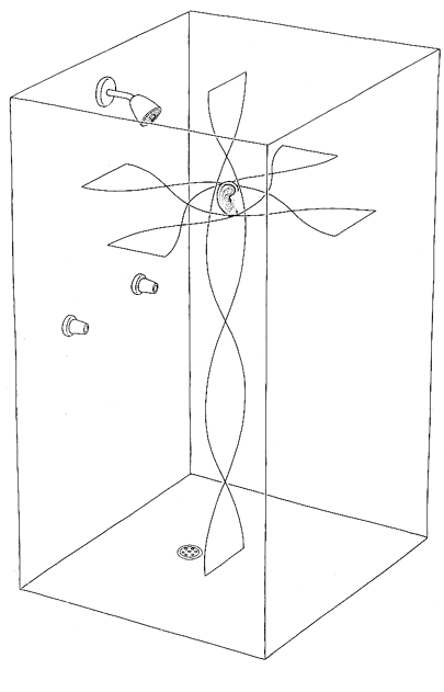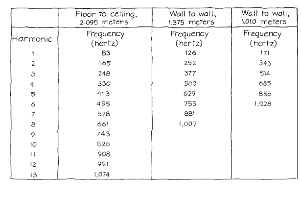 of the singer are approximately a fourth of the distance from the ceiling to the floor. In theory he could both excite and hear the fundamental because his mouth and ears are not at a node of the associated standing wave. Since they are also not at an antinode, he cannot excite or hear a strong fundamental. The second harmonic cannot be excited or heard because his head is at one of its nodes. Among the standing waves depicted in the illustration the third, fourth, seventh and eighth harmonics would come out best. The singer is somewhat more mobile when it comes to the standing waves between a pair of walls. By moving toward or away from a wall one can modify the spectrum of harmonics that are excited and heard. At the center of the stall the fundamental from each pair of walls would be absent, since both fundamentals have nodes there. The second harmonics have antinodes at that position and would come into play. By moving closer to a wall the singer would eliminate the second harmonic but would excite the third. The harmonics of the walls are complicated by the horizontal separation between the mouth and the ears. For some harmonics the mouth might be in the right place to excite a standing wave while the ears were at a node. (To study this problem adequately one must also consider the distortion of the standing wave by the head.) A further complication arises because the harmonic frequencies are not precisely as they are shown in the illustration above. The numbers there depend on the speed of sound, which may change as the air in the stall gets warmer from the shower. Even without any change in the speed of sound the frequencies are not sharp but extend over a range of about 10 hertz. A standing wave is excited most efficiently when the singer's voice is pitched at a frequency listed in the table. the wave is weaker if he is slightly off the theoretical value. Another complication results from the fact that the singer's body occupies space in the stall, reflecting some of the sound. It is best to assume that this complication is secondary to the principal mechanism of creating standing waves. Modeling the resonances as if the stall is a pipe with closed ends at least makes possible an approximation of the resonant frequencies. The frequencies tabulated in the illustration above are for my shower stall, which has flat tiled walls, floor and ceiling. One wall is a glass door. I calculated these harmonic frequencies (1,000 hertz or less) assuming the speed of sound to be 346 meters per second in the stall. The frequency of the fundamental is then the speed divided by twice the distance between a pair of reflecting surfaces. Since the floor and the ceiling are farther apart than the walls, the floor-ceiling fundamental is lower in frequency than the fundamentals for the walls. The higher harmonics are calculated by multiplying the fundamental frequency by an integer. The second harmonic is twice the fundamental, the third three times the fundamental and so on. Now, suppose I begin to sing in the shower, somehow adjusting my vocal cords so that their fundamental is 330 hertz but failing to match the fundamental of my vocal tract. The vocal cords deliver frequencies at integral multiples of the fundamental, namely 330, 660, 990 hertz and so on. Suppose the fundamental of my vocal tract is set at 450 hertz. Its next resonance is at 1,350 hertz (the third harmonic). Outside the shower stall my singing would sound weak, since none of the frequencies from the vocal cords resonate in the vocal tract. Inside the stall, however, the frequencies at 330 and 660 hertz create standing waves between the floor and the ceiling, the lower frequency exciting the fourth harmonic and the higher one the eighth. (The sound at 990 hertz should excite the 12th harmonic, but my mouth is at the node for that resonance.) I therefore sound great in spite of the absence of resonance from my vocal tract. Wanting to experiment with the harmonics in my shower stall but not being able to hold a note for very long and not being skilled in determining the frequency of the note, I substituted for my voice an audio oscillator and a loudspeaker. The oscillator emitted a sinusoidal wave at whatever frequency I set on the dial. The signal, strengthened by an amplifier, was directed to a speaker cone I could put anywhere in the stall. The cone had an aperture of 19 by 12 centimeters; a smaller cone would not emit the low frequencies. If you decide to experiment in this way, bear in mind that around water an electrical appliance is dangerous. I turned off the water at the valve supplying the shower. Another danger is that the sound of a standing wave excited in the stall can be loud enough to hurt your ears, particularly if the amplifier is set at high volume. I wore a set of headphones of the type that keeps out noise. By tuning the oscillator through the range from about 200 to 1,000 hertz I could hear the resonances come and go. When the oscillator was out of resonance, the sound in the stall was relatively weak. At the resonances it increased, sometimes dramatically. Keeping the oscillator at some resonant frequency, I could alter my perception of the sound by moving my head around in the stall. As my ears moved from an antinode to a node the level of sound dropped sharply. With a few experimental moves I could usually determine whether the standing wave was between a pair of walls (and, if it was, which pair) or between the floor and the ceiling. The loudspeaker's efficiency at exciting a standing wave depended partly on how I pointed it. Pointed upward it could only weakly excite a standing wave between the walls even though it was set at the right frequency. I found that when I put the speaker at an angle in a corner on the floor, the sound that spread from the cone was directed more or less correctly for any possible standing wave.