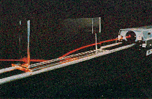 The refraction of a laser beam passing through the GRIN lens near what was originally the bottom is shown in the top illustration above. The beam travels through a gradient in the index of refraction. The part of the beam passing through the area with a higher index is delayed with respect to the part that goes through the area with a smaller index. As a result the beam is deflected toward the side that was originally the base. The optical properties of this GRIN lens are something like those of half of a concave cylindrical lens, as is shown in the illustration on the left. Near the areas with a high gradient in the concentration of potassium nitrate light is strongly deflected, as it would be in the outer part of the concave lens. The deflection in the areas with a smaller gradient of potassium nitrate is much as it would be in the center of the concave lens. If the diffusion of the potassium nitrate into the epoxy could be precisely controlled, one could presumably make a GRIN lens to match any conventional lens. If you make a GRIN lens the way Meyer-Arendt and Zilm did, you might want to investigate its chromatic properties. Unless you have access to laser light of various colors, you will have to work with partially coherent light from a pinhole. The source could be any bright light filtered to narrow the range of color in the beam. You will need a mask or a stop to confine the light to only a small area of the GRIN lens. A good demonstration of gradient index refraction published by William M. Strouse is cited in the bibliography [below]. He directed a beam of light through a pair of lenses (to narrow it) and then into a tank filled with a solution of sugar in water. The tank was two centimeters wide, eight high and 20 long. Strouse put in three centimeters of water and added three lumps of sugar, which he allowed to dissolve undisturbed. As the sugar diffused through the water it created a gradient that was highest near the bottom and lowest near the top. The index of refraction therefore changed from high to low in the same direction. When the beam was directed into the solution near the bottom of the tank, it curved downward and was reflected off the bottom. The reflected beam continued to curve. With a long tank the beam would bounce along the bottom. Seen from above, the beam maintains the same width as it crosses the tank. Seen from the side, it narrows periodically. This partial focusing is also due to the gradient of the index of refraction. The gradient redirects the rays in differing degrees, so that the beam narrows in some parts of the solution and widens in others. Strouse said the phenomenon is enhanced if the lenses installed to narrow the initial beam are removed. The beam gets wider and is therefore easier to follow. Bibliography BOUNCING LIGHT BEAM. William M. Strouse in American Journal of Physics, Vol. 40, No. 6, pages 913-914; June, 1972. TRIBOLUMINESCENCE SPECTROSCOPY OF COMMON CANDIES. Rebecca Angelos, Jeffrey I. Zink and Gordon E. Hardy in Journal of Chemical Education, Vol. 56, No. 6, pages 413-414; June, 1979. Suppliers and Organizations The Society for Amateur Scientists (SAS) is a nonprofit research and educational organization dedicated to helping people enrich their lives by following their passion to take part in scientific adventures of all kinds. The Society for Amateur Scientists |