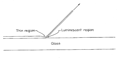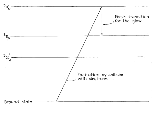 nitrogen. It was clear that the glow did not originate in the molecules of the sugar itself, because they would yield an entirely different spectrum. The spectrograph shows that the triboluminescence of sugar has several bright peaks near the ultraviolet region of the spectrum. Strong emissions appear at 330 and 360 nanometers, weaker ones near 315 and 380. The visible glow is fainter, lying between 380 and 435 nanometers (the violet and blue regions of the spectrum). If the eye could see farther into the ultraviolet, the glow would be brighter because the strong emission peaks would then be visible. The crushing of sugar crystals somehow excites the molecular nitrogen associated with the sugar. An analysis of the spectrum indicates that the nitrogen is excited from its lowest molecular energy state to the 3¹u state. It quickly drops to the 3¹g state, emitting light in a certain assortment of wavelengths. It is these wavelengths that can be identified as the assortment unique to molecular nitrogen. The role of nitrogen can also be demonstrated by removing from the sugar a much nitrogen as possible. When sugar is crushed in a vacuum, the glow is dimmer. It is still there because even in a vacuum some molecules of nitrogen are adsorbed on or absorbed by the sugar. When nitrogen is entirely eliminated, as Zink has managed to do, the glow disappears. The importance of the ambient gas is similarly revealed when other gases are substituted for nitrogen. When the sugar is placed in an atmosphere of neon at low pressure, the glow from crushing the sugar is red. The neon is somehow excited by the pressure; it then deexcites much as it does in neon signs. Neon's emission is strong in the red region of the spectrum.