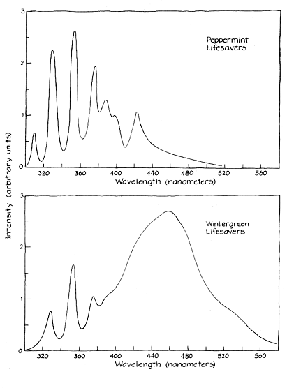 Certain hard candies display additional colors. Zink and his associates have found, for example, that wintergreen Lifesavers give off more of a blue green color than other flavors, which have the weak blue emission of sucrose. The reason is that the ultraviolet radiation of the nitrogen is absorbed by the methyl salicylate (oil of wintergreen) with which the candy is flavored. When the methyl salicylate deexcites, it emits in a broad range from about 400 nanometers to about 540. The chewer sees a composite of the spectrum from molecular nitrogen and methyl salicylate. I demonstrated triboluminescence by grinding table sugar and various sugar products in a beaker after giving my eyes time to adapt to darkness. What you grind with does not seem to matter. I had good results with either the blunt end of a metal table knife or a wood dowel. Nor does it matter whether the beaker is made of glass, plastic or metal. (Be careful with glass. Since you are working in the dark, you could break a glass beaker by applying pressure in the wrong way.) The amount of light emitted by sugar seemed to diminish as I continued grinding. Sugar made slightly damp by the humidity in the room gave off a fainter glow. Sugar dissolved in water did not glow unless I hit an undissolved crystal with the grinding tool. Many of the liquids and powders for washing clothes have a component that absorbs ultraviolet and emits in the visible spectrum. (The aim is to make the clothes look whiter.) I added one of these products to sugar but saw no difference in the glow. I also studied the glow from several flavors of Lifesavers. To spare my teeth I followed Zink's suggestion of crushing the candy with a pair of pliers. Wintergreen yielded the most easily seen light, apparently because of the emission from the methyl salicylate.