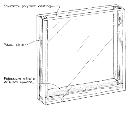 A gradient-index lens (called, for obvious reasons, a GRIN lens) is unconventional in that its index of refraction varies internally. In one type of GRIN lens the index varies along an axis perpendicular to the optical axis (the axis along which the light is directed). The center of such a lens might have an index of refraction higher than that of the periphery. When light passes through the lens, the rays near the optical axis are deflected weakly but those away from the optical axis are directed strongly toward it. Then even if the lens has flat, parallel exterior surfaces, it can focus light like a conventional convex lens. If the surfaces are curved, the light is refracted even more. A second type of GRIN lens has its gradient along the optical axis rather than perpendicular to it. The index at the front surface is different from the one at the rear surface, and it varies smoothly between them. A third type of lens would have a spherical gradient in its index of refraction. For example, the index might decrease outward from the center of the lens in a spherically symmetrical way. Although I do not know if any lens of this third type has ever been made, James Clerk Maxwell studied its - optics more than a century ago. A prototype is the crystalline lens of the eye. Several simple applications have been found for GRIN lenses, but the lenses are not common because it is hard to make them. Jurgen R. Meyer-Arendt of Pacific University and his student Mark R. Zilm recently described to me an easy way of making a simple GRIN lens. They have made one that behaves like a concave cylindrical lens. In essence their lens consists of clear epoxy into which potassium nitrate has been allowed to diffuse, thereby creating the gradient in the index of refraction. A container for the material is made with two square pieces of glass, each piece 50 millimeters on an edge and 2.05 millimeters thick. They are held parallel and separate by thin pieces of wood (matchsticks) that are 50 millimeters long and three millimeters square in cross section. The wood was originally balsa, but Meyer-Arendt and Zilm later found that the hard wood of matchsticks is better. The wood is glued along three edges of a piece of the glass with a silicone seal glue. (Other types of glue might not work as well because the glue might diffuse into the epoxy.) The fourth side of the container is left open so that the epoxy and potassium nitrate can be poured in. Potassium nitrate