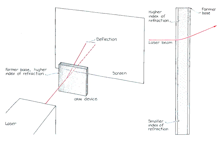 (KNO3), otherwise known as saltpeter, can be bought in a drugstore. The epoxy chosen by Meyer-Arendt and Zilm is Envirotex polymer coating, which is sold in stores that deal in materials for paper-cutout decoration (decoupage). The potassium nitrate is packed to a uniform depth of about two millimeters at the bottom of the container, which is then filled with the epoxy. Meyer-Arendt and Zilm modified the usual procedure for mixing epoxy because they wanted the material to take longer to harden so that some of the potassium nitrate would have time to diffuse into it. The standard ratio of hardener to epoxy is 1:1; they made it 1:4. They tried even smaller amounts of hardener but found that air bubbles were trapped in the mixture when it hardened. After three weeks in which the container was left undisturbed the potassium nitrate had diffused upward into the epoxy and the entire mixture had solidified. The result was a GRIN lens with an index of refraction that varied upward. The index was highest at the bottom, where the potassium nitrate was concentrated, and lowest near the top, where no potassium nitrate had penetrated. Meyer-Arendt and Zilm devised a simple experiment to demonstrate the refractive characteristics of their device. First they etched a grid on one of the pieces of glass at the side of the assembly. Each rectangle in the grid was three millimeters high and four millimeters wide. The GRIN lens was then set on one edge so that what had been the base was now vertical. The next step was to direct a laser beam through one section of the grid. The light passed through the lens and fell on a screen 10 meters away. Ascertaining first where the laser beam hit the screen when the lens was not in place and then where the beam hit after passing through the lens, Meyer-Arendt and Zilm could measure how much the lens deflected it. They repeated the measurement along a line of grid sections ranging from the high-index part of the lens to the low-index part.