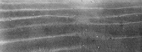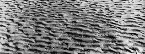 It was interesting to see an outgoing flow meet an incoming wave. Even with a strong incoming bore the result was often a standoff as the backwash dissipated the bore's energy. The bore was reduced to a quiet surge unless it was overtaken from the rear by a new bore. An intriguing feature of the water in a backwash is the appearance of capillary waves. Such waves are governed by surface tension rather than by gravity. Golrick and I had trouble tracking them because they move fast and also because they are hard to see unless the light is reflected from them at a certain angle. My impression is that capillary waves seldom have more than three or four crests. The waves move faster than the line of water retreating from the shore does, and they often move in a different direction. I do not know what causes capillary waves, but I would guess they result from a gust of wind or from an irregularity in the sand. Except in shallow areas along a beach a given parcel of water associated with a wave has no net motion. In deep water such a parcel moves in a vertical circle as a wave passes over it. Closer to the beach the movement is elliptical with the short axis vertical. Along the beach however, a parcel in an advancing or retreating sheet of water hops. The hopping movement picks up grains of sand that are then carried along with the moving sheet. Watching a mild backwash, I could follow the grains as they were picked up, carried and dropped. A backwash running over a small object buried in the sand gouges a short trough seaward of the object. The trough behind a shell I buried in sand was about two centimeters long. Apparently the outgoing water grew turbulent enough seaward of the shell to lift grains of sand and carry them for that distance. Waves can leave a variety of patterns in sand. At low tide Golrick and I found irregularly spaced marks that were concave toward the ocean. The marks delineated the upper reaches of waves that had come in at high tide. Each runup leaves a high-reach line on the beach because it has carried sand to that point before receding. While the tide is coming in most of these lines are erased by backwash, but while the tide is going out a series of unerased swash marks remains on the beach.