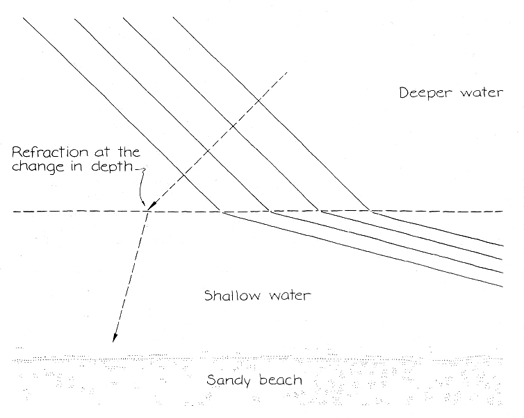 One thing to notice is that whereas the waves in deep water move in many directions, the waves coming onto a beach have a uniform direction of movement that is more or less perpendicular to the shoreline. The explanation starts with the fact that the waves are slowed as they move into the shallow water near the shore and begin to "feel" the bottom. A wave coming into shallow water at an angle that is not perpendicular to the shoreline is slowed first at the inshore end while the remainder of the wave front is still traveling relatively fast. The result is that the wave is slewed so that its direction of travel becomes perpendicular to the shoreline. In other words, the wave is refracted. Another thing to notice is that the waves in deep water have a fairly uniform undulating shape, whereas waves: in shallow water display a variety of shapes. Four groups of breaking waves can be identified. First, in what is called spilling, the wave retains its usual shape but a layer of foam spills down the for. ward slope. Second, a plunging breaker: develops when the crest of the wave overruns the lower section and drops in front of the base in a sheet. (Surfboarders value this kind of breaker. In "shooting the pipeline" the surfer maneuvers his board to run under the sheet of falling water.) Third, a collapsing wave breaks into foam and turbulence forward of the crest. Fourth, in surging, the wave quietly ascends the sloping shore with little turbulence.