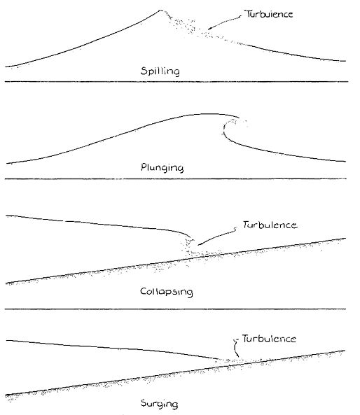 I have examined beaches and breaking waves in two places: along the ocean near Charleston and Kiawah Island in South Carolina and along Lake Erie near Cleveland. In South Carolina I had the aid of Mary Golrick. Along the shore we found that many waves showed several of the breaking characteristics simultaneously. For example, part of the wave could be spilling while another stretch was plunging, or a spilling wave could begin to collapse or surge. Even at a particular spot the appearance changed from wave to wave, presumably because of variations in the height of the waves and the speed of the wind. At some places the shape of the waves was more consistent, probably because the configuration of the bottom determined what type of breaker would predominate. Often a wave rolling up the beach collapsed or plunged, creating a nearly vertical wall of highly turbulent water. For a time such a wave would move up the beach fast and noisily, but then it would abruptly lose its energy and become slower. These waves are examples of the solitary waves called bores or hydraulic jumps, which I described in this department for April, 1981.