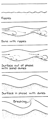 Seaward of a swash mark on some beaches one is likely to find smaller diamond-shaped markings left by the backwash. Willard Bascom discusses them in his book Waves and Beaches: The Dynamics of the Ocean Surface, a valuable source of information for any student of beach physics. He says the marks are made by the backwash on a beach with a fairly steep slope. On a beach with a gentle slope the backwash does not move fast enough to dig these tiny valleys, but even there you can find small, irregular lines that point more or less toward the ocean. Many small domes can be found on a sand beach. They are made by the water sinking into the sand. Before the water arrives the spaces between grains of sand are mostly filled with air. The sinking water pushes air upward through a small opening. You can usually spot such an opening by the bubbles the escaping air makes in the adjacent water.; A dome forms when successively deeper layers of sand are affected by the sinking water. One incoming wave wets a layer of sand near the surface. If more water enters from later waves, the air in the deeper reaches of sand is trapped by the wet top layer of sand. Water moving into the spaces between grains of deeper sand increases the pressure of the trapped air, which pushes the surface of the sand up into a dome. On both the damp area of beach left by a receding tide and the area still being washed by waves one finds systems of sand waves with wavelengths of sever al centimeters. They are complex structures because they are created by moving water and then they alter the movement of the water. Bascom describes two types. In one type the moving water causes the crests of the sand waves to oscillate, with individual grains of sand being transported back and forth in the trough of the wave. In the second type the crests are almost stationary. As water sweeps over them, swirls are set up in the troughs. You can see the deposition of sand grains in a swirl as the re ceding water becomes thinner. Water left in a trough usually drains along it, since the sand waves are seldom exactly perpendicular to the slope of the shore. A breeze will send scores of capillary waves along a trough of water. The troughs make even shallow sand waves easy to see because their crests stand above the flowing water. The shape of sand waves depends on how fast the surf is moving. Shapes range from fine ripples to large dunes. The dunes modify the flow of water. When the waves of water are out of phase with the dunes, the water flowing over a dune breaks into a vortex that digs into the valley between the dune and the next dune. Because of the flow the dunes are irregularly shaped. When waves of moving water are in phase with dunes, the shape of the dunes is smoother and rounder.