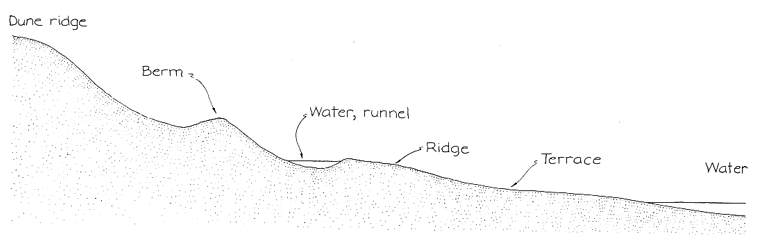 On a larger scale a typical beach usually has several variations in height superposed on the general slope toward the water line. The structure is best seen at low tide. At the top of the beach are dune ridges that define the upper boundary of the beach. Below them is a smaller elevation of sand called a berm. It is the line the water reaches at high tide. Another ridge may lie between the berm and the ocean at low tide. Between the ridge and the berm may be a small pool of water, which is called a runnel. A terrace of sand may run from the ridge to the low-tide line. The creation and destruction of these features are major concerns for engineers studying the erosion of beaches. A severe storm is likely to change the features drastically;- Even in the absence of storms the features are slowly modified by the tides. The beaches along Lake Erie do not show the effects of tide and appear to be affected more by storms than by a gradual movement of sand up onto the shore. On one shore near Cleveland the lake floor drops off sharply only about a meter from the line representing the upper reach of incoming waves. The ridge of sand left by those waves is narrower but more prominent than the wave-built ridge on Kiawah Island. I found no runnels along the lake, although the highwater debris inshore of the ridge shows that at times the waves reach higher than the ridge.