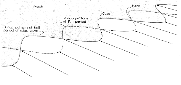 Many shorelines exhibit cusps, which constitute one of the strangest and prettiest sights to be seen on a beach. A cusp is a thin sheet of water forming a horizontal curve as it washes up the slope of the beach. Between each cusp and the next one is a section of beach forming a curve in the opposite direction. The diameter of a cusp can range from less than a meter along the shore of a lake to 100,000 meters or more for major shoreline features along an ocean. The large-scale features are often called giant cusps or shoreline rhythms. Sometimes they are so irregularly spaced that they go unnoticed. Elsewhere the periodicity of the cusps is so precise that the shoreline looks artificial. According to Bascom, the cusp pattern is maintained by the interaction of two waves that impinge consecutively on the shore. The first one enters an existing cusp carrying a load of suspended sand. Then the wave divides so that the sand is carried to the inner border of the cusp. During the backwash the water flows to the center of the cusp, where there is a troughlike configuration that carries it back to the sea. At the mouth of the trough the incoming second wave is arrested by the backwash, whereas at the horns of the cusp the new wave is essentially undeterred. It is therefore able to bring in more sand and to deposit it along the inner border of the cusp. The process continues with succeeding waves. The source of the periodicity of cusp formations along a shore was unknown until recently. Now a number of workers,