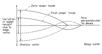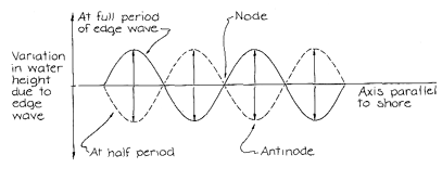 including Anthony J. Bowen of Dalhousie University and Robert T. Guza and Douglas L. Inman of the Scripps Institution of Oceanography, have ascribed the periodicity to edge waves, which are created along a shoreline by other waves coming in from deep water. An edge wave varies sinusoidally in height on an axis parallel to the shore, as is shown in the upper illustration on the right. Points of maximum and minimum height are antinodes. between them are nodes, where the water level does not vary. (The illustration shows only the variations in height due to the edge waves. On a sea beach the variations caused by the incident deep-water waves are superposed on the edge waves to yield the observed differences in water height.) Seen in cross section along an axis perpendicular to the shore an edge wave has several modes representing variations in its amplitude. They are shown in the lower illustration below. In the simplest mode the amplitude of the edge wave drops off continuously toward the deep water; this is the zero mode. I shall focus on it because it seems to have the most to do with the features that are due to edge waves.