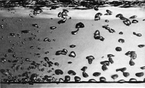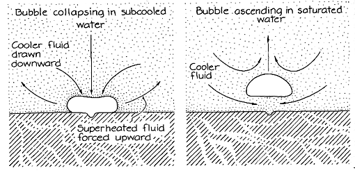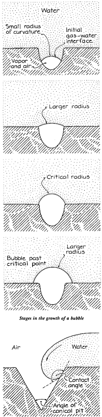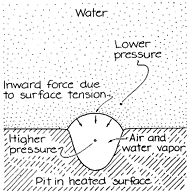The generation of bubbles starts in the tiny pits and short cracks on the bottom of a container. Although the bottom of a metal pan may appear to be smooth, it is covered with such small irregularities. Some of them trap air when water is first poured into the pan. Surface tension then prevents the water from entering them. The tiny pockets of trapped air serve as the nucleating sites for the air and vapor bubbles that develop as the water is heated. A vapor bubble grows at a nucleating site as superheated water vaporizes into the air in the pit. Theoretically there is an equilibrium at the radius of the bubble. At that point the vapor pressure in the bubble matches the external pressure from the overlying water and the surface tension of the water at the interface between the bubble and the water. Usually, however, the bubble is unstable in the sense that if any perturbation makes the radius smaller, the surface tension overwhelms the internal vapor pressure, causing the bubble to collapse. If something makes the radius larger, the liquid at the interface vaporizes into the bubble, causing the bubble to grow. The theoretical value for the radius of a stable bubble depends in part on the temperature of the surrounding water. At first the water is not much superheated. The stable radius is large, with the result that the growth of bubbles is rare since most of the nucleating sites are occupied by small bubbles. As the temperature of the water increases, the value for the stable radius decreases. The formation and the growth of bubbles become likelier. When the temperature of the water increases, the heat flux into the water also increases at least in the stage of isolated bubbles. The increased influx of heat does not go directly into the bubbles. Rather the bubbles act as tiny pumps that continuously bring cooler water in contact with the heated surface of the pan. Suppose the water is not hot enough to allow a bubble to escape toward the top. The bubble, situated over a nucleating site, has a radius larger than the radius for a stable bubble. Therefore it grows as water vaporizes into it. The bubble's growth, however, pushes its top surface up into cooler water. There vapor condenses even as water continues to vaporize at the heated surface. The top of the bubble begins to collapse and then the entire bubble collapses. The collapse drives a tiny circulation, with the superheated water at the bottom of the bubble springing up and the cooler water at the top dropping down. The cooler water is then heated. This circulation increases the rate at which heat is transferred to the water. Later in the heating process the vapor bubbles break free of the heated surface. As a bubble grows over its nucleating site it absorbs heat from the surrounding superheated liquid. When the bubble escapes, it entrains in its wake cooler water from higher above the heated surface. That circulation of cooler water. enhances the heat flux into the water. The heat flux is further enhanced because in this later stage of nucleate boiling more nucleating sites are active. The actual rate of heat transfer to the water in nucleate boiling depends in part on the nature of the heated surface. A bubble tending to form at a nucleating site has a radius partly determined by the size of the pit at the site. Large pits or pits with flat bottoms, however, are relatively ineffective in bubble nucleation. The smaller the pit, the smaller the bubble that tends to form over it. Particularly small pits, however, probably have no role in the initial onset of bubble generation. The bubbles that form in small pits are smaller than the radius for stability and therefore tend to collapse. As the water temperature near the heated surface increases, the radius for a stable bubble decreases and the smaller pits become more active.