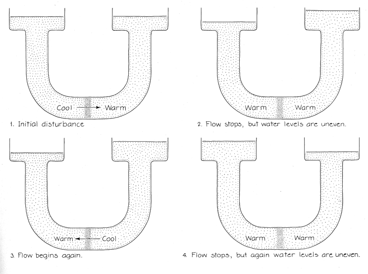 Pierre Welander of the University of Washington has devised a novel thermal oscillator based on water. The opening on each side of a U-tube is fitted with a wide container. The tube and about half of each container are filled with water. The tops of the containers are open. The bottom of the tube is heated; the upper sides are cooled. Soon the water level in the apparatus begins to oscillate between the two sides with a period of between several minutes and several hours. Suppose the system is initially in complete equilibrium with its two sides containing equal amounts of water at the same temperature distribution. Consider a tiny volume of water lying within a thin slice through a cross section at the bottom of the tube. The volume is pressed from both sides because of the weight of the water in the two sides of the tube. Two factors determine the weight of a column of water: the height of the column and the density of the water. The density is determined by the temperature: cooler water is denser than warmer water. Since initially the two sides of the system are identical in water level and temperature distribution, the central volume of water is pressed equally from both sides. It remains stationary and all the water is in equilibrium. Suppose a disturbance from the environment causes a small amount of water to move from the left side to the right. The flow upsets the symmetry of the system; now the two sides differ in both water level and temperature distribution. The motion lowers the level on the left side and moves cooler water downward. It raises the level on the right side and moves warmer water to the right at the bottom of the U-tube. If the containers on top of the U-tube are wide, the changes in the water levels are initially small. The broken symmetry of the temperature distribution is more important. Since the cooler water at the bottom left is denser than the warmer water at the bottom right, the central volume of water is no longer under equal pressure from the two sides. The left side now pushes more. The uneven pressures tend to push more water to the right. Although the initial change in water levels is small, the continued flow increases the difference until it is significant. Eventually the right side applies more pressure on the central volume than the left side because of the difference in the water levels. The flow from left to right is slowed and then stopped. The process is gradual, however, and so the heating and cooling of the tube has a chance to reestablish the temperature symmetry. By the time the flow stops the system is again approximately symmetrical in temperature, but now the level is higher on the right side than on the left. The water begins to flow back to the left side, and the cycle is renewed in the opposite direction. The system remains in oscillation. The oscillating flow continues indefinitely because of the heating and cooling of the tube. If the tube is allowed to reach a uniform temperature, the oscillation soon damps down into a stable situation with equal water levels on the two sides. As long as the heating and cooling are continued, however, the oscillation is maintained. Every time the system passes through the state where the two water levels are equal the imbalance in densities drives the water until the levels are unequal, continuing the oscillation.